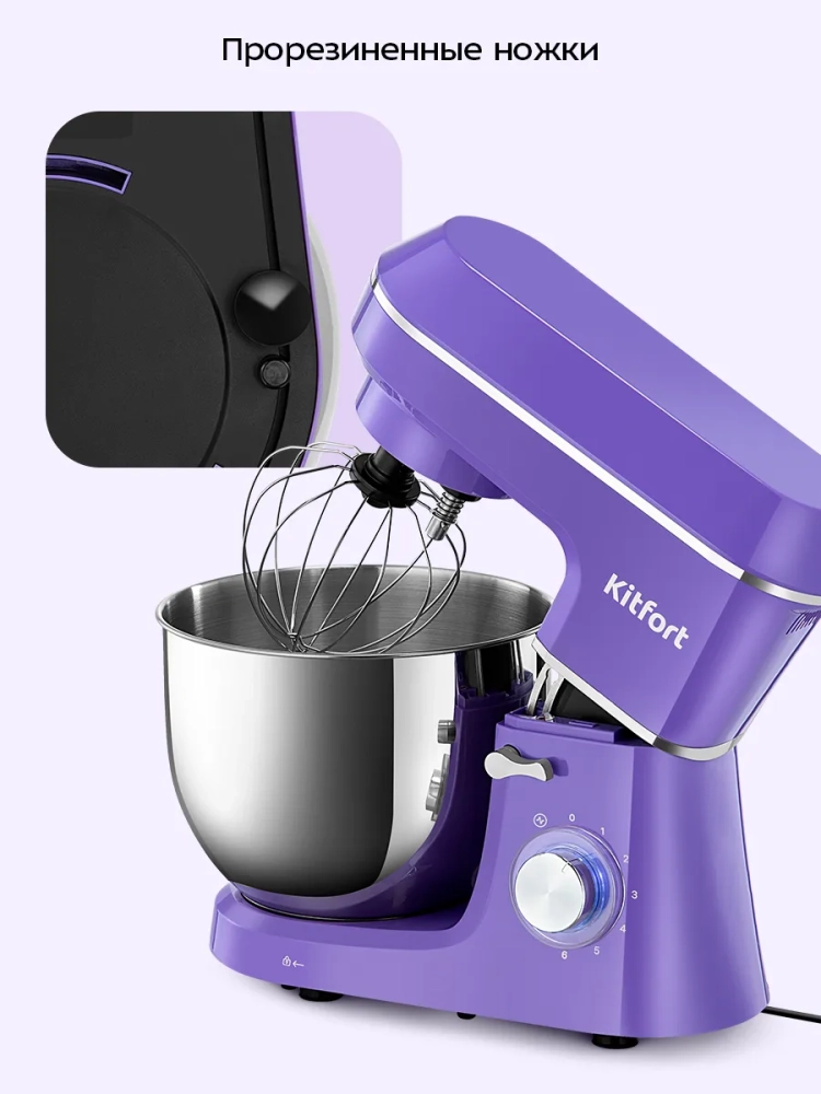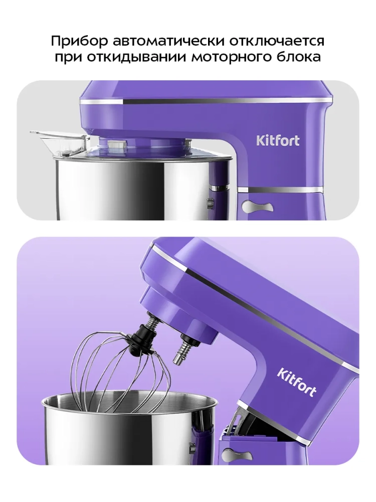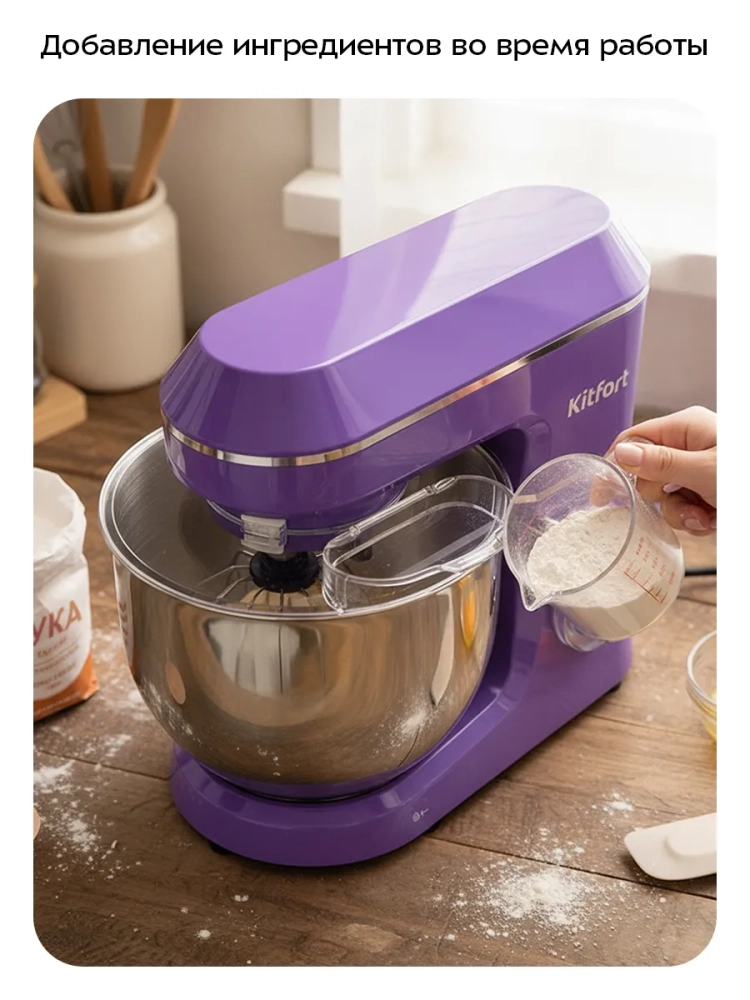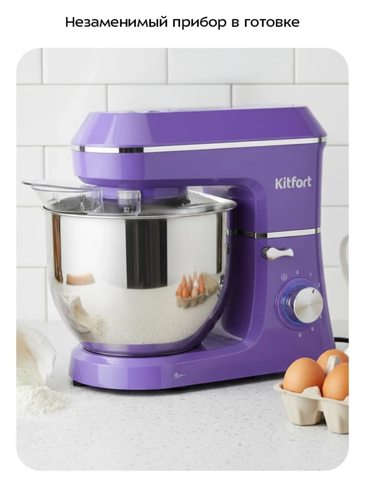 Планетарный миксер Kitfort КТ-4432 поможет вам смешать ингредиенты, взбить яичный белок или сливки, приготовить картофельное пюре, соус, крем, мусс, замесить жидкое тесто для блинов и крутое — для пельменей и пирогов.