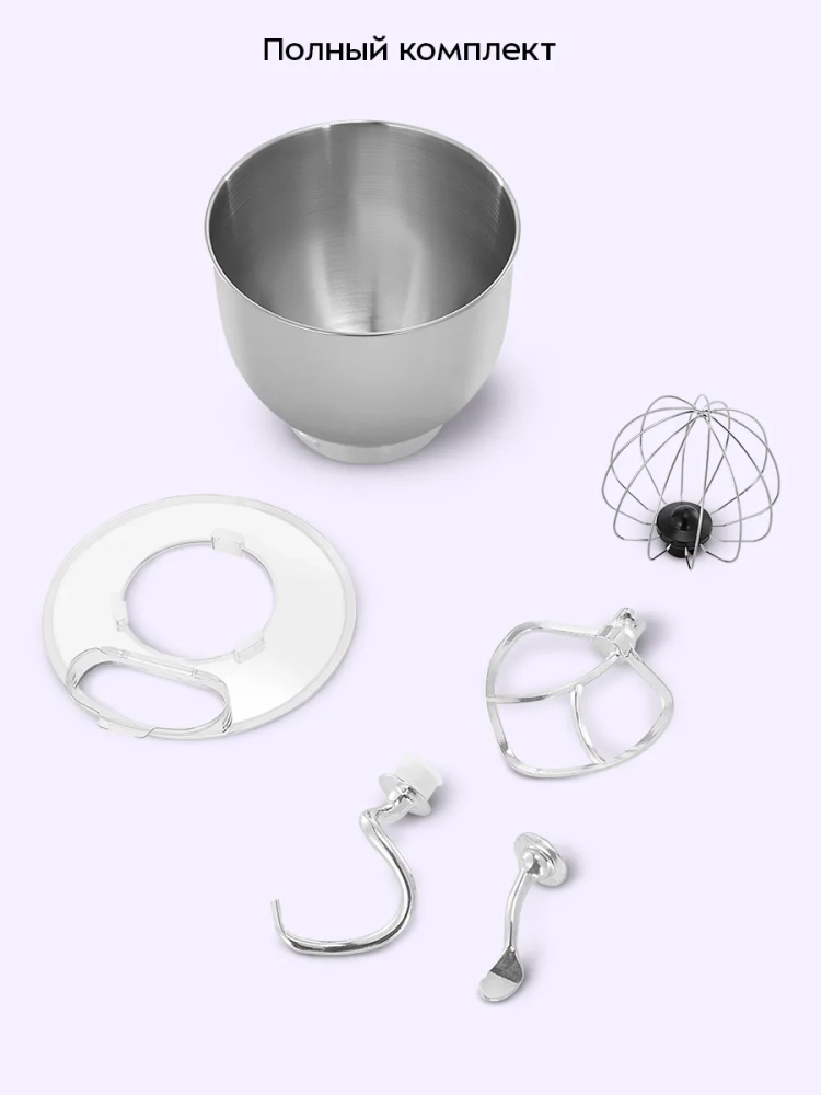 В комплекте есть четыре насадки. Венчик служит для взбивания яичных белков, сливок, замешивания жидкого теста. Насадка для смешивания используется для негустых ингредиентов, приготовления картофельного пюре, томатной пасты, кондитерских смесей или теста для тортов. Большой и малый крюки для замешивания подойдут для замешивания густого теста.