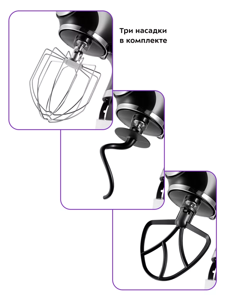 Венчик служит для взбивания яичных белков, сливок, замешивания жидкого теста. Насадка для смешивания используется для негустых ингредиентов, приготовления картофельного пюре, томатной пасты, кондитерских смесей, теста для тортов или блинов. Крюк для замешивания подойдет для замеса густого теста.