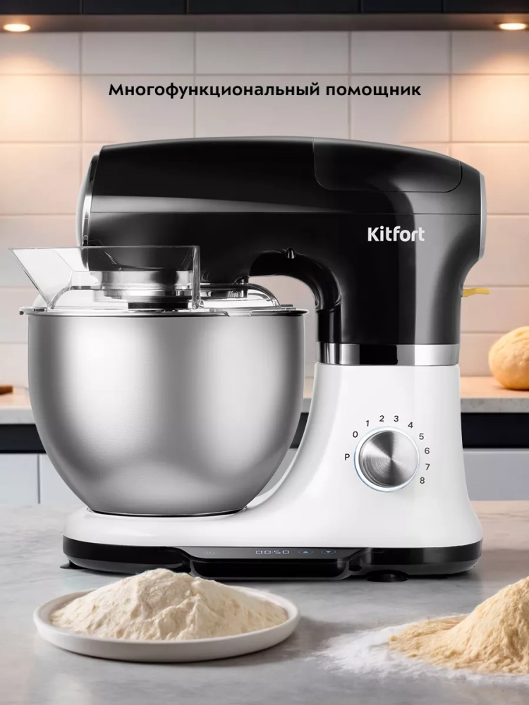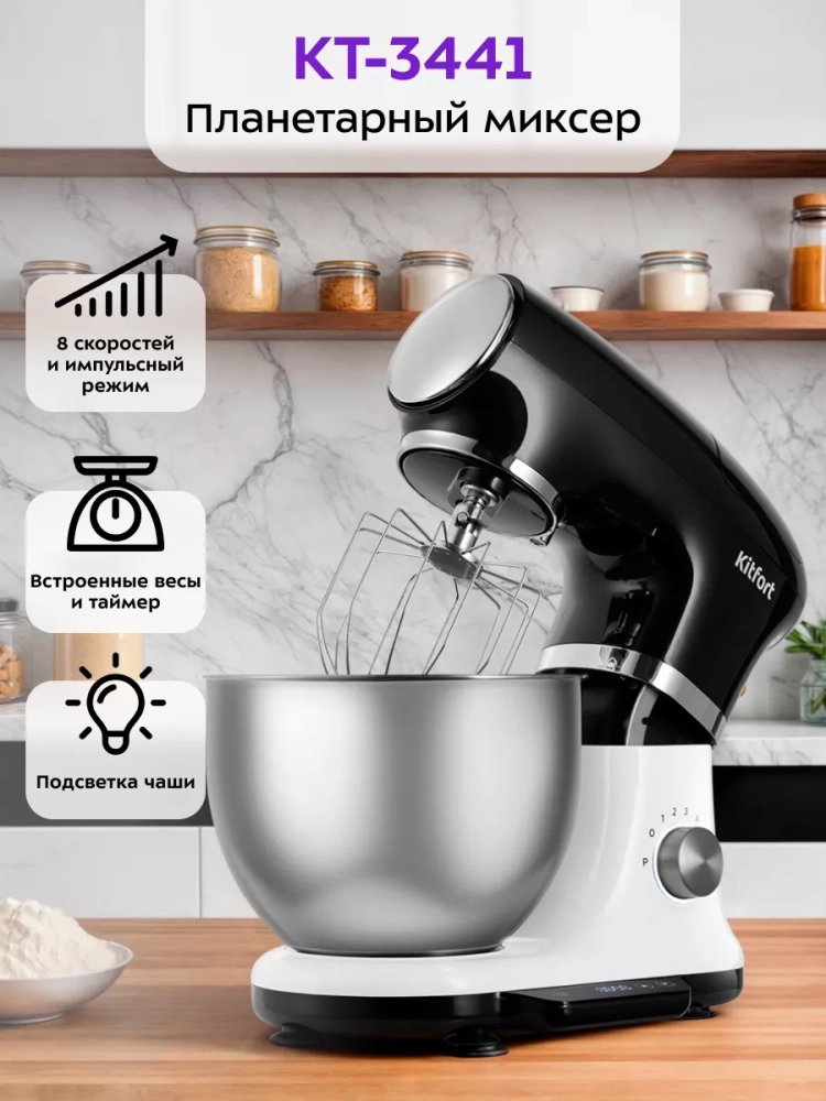 Планетарный миксер Kitfort КТ-3441 поможет вам смешать ингредиенты, взбить яичный белок или сливки, приготовить картофельное пюре, соус, крем, мусс, замесить жидкое тесто для блинов и крутое — для пельменей и пирогов. В комплекте к миксеру идут три насадки.