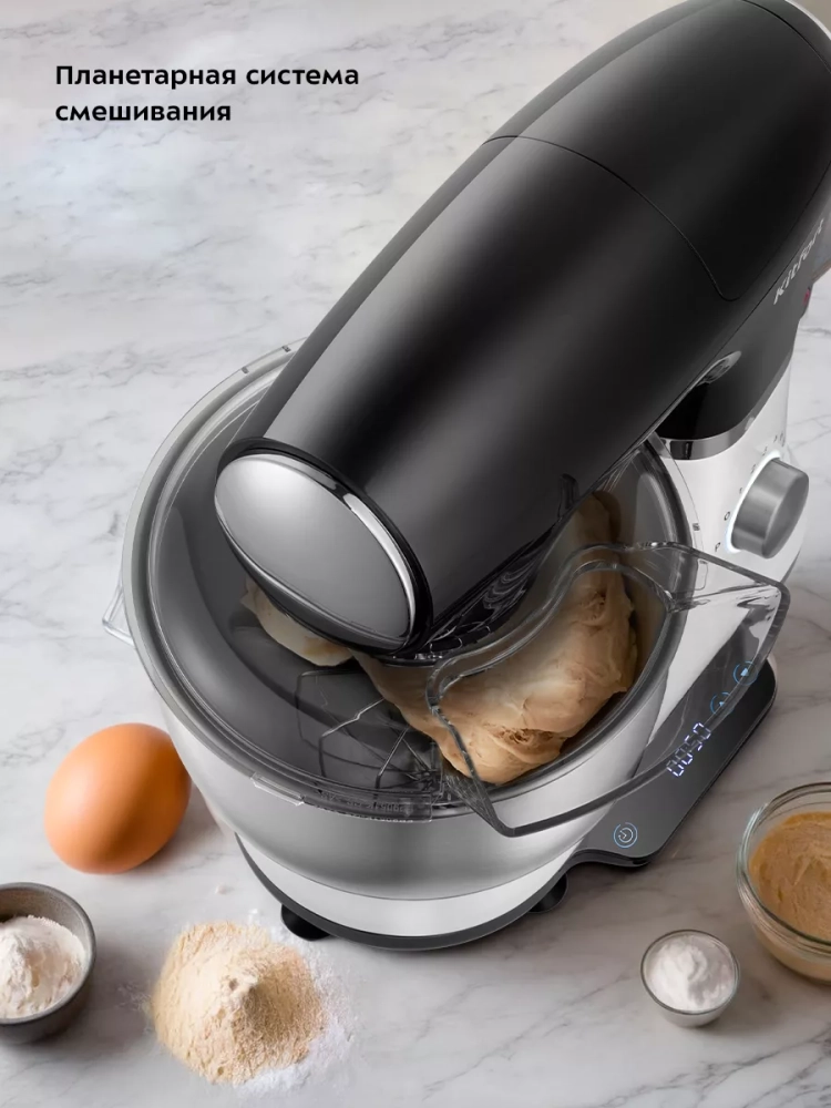 Миксер оснащен планетарной системой смешивания. Это обеспечивает идеальное качество смешивания без комков. Прорезиненные ножки с присосками прочно фиксируют миксер на столе. Встроенный вентилятор принудительно охлаждает мотор потоком воздуха, так что он не перегреется при работе на высоких скоростях или при замешивании крутого теста.