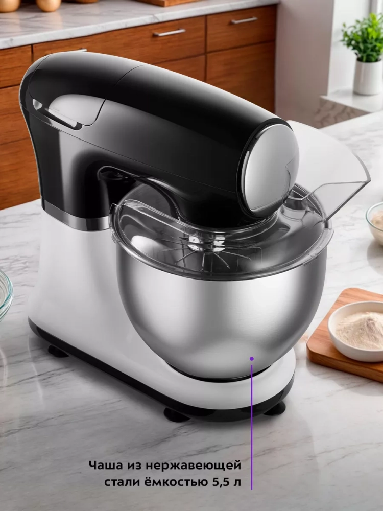 Миксер оснащен большой чашей из нержавеющей стали емкостью 5,5 литра. В чаше можно смешивать даже горячие ингредиенты.