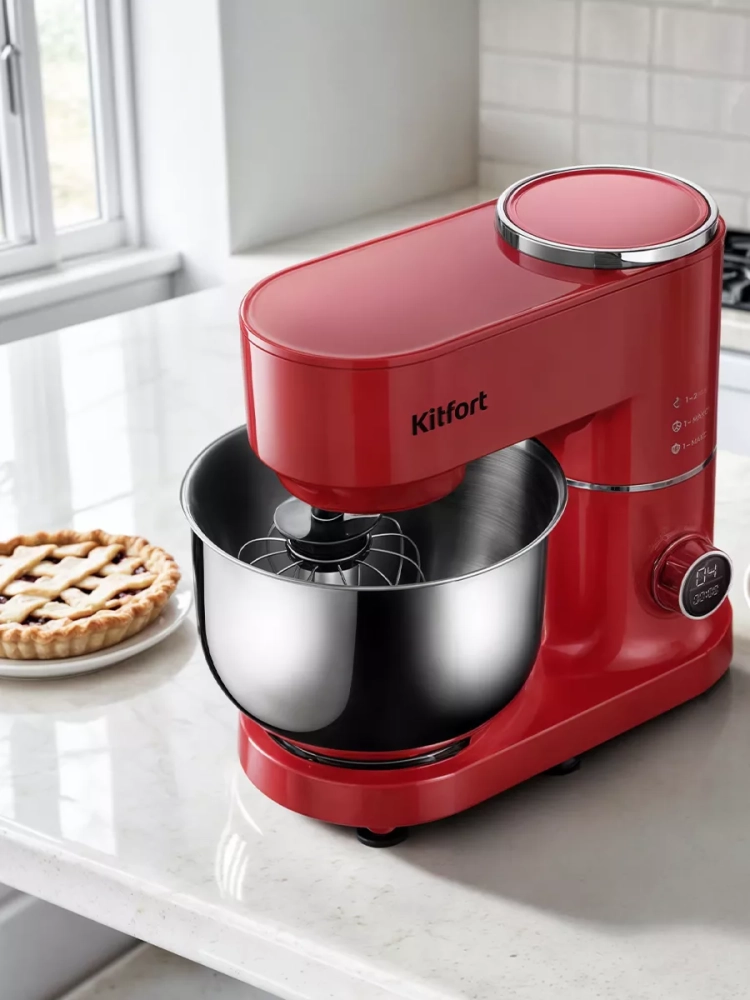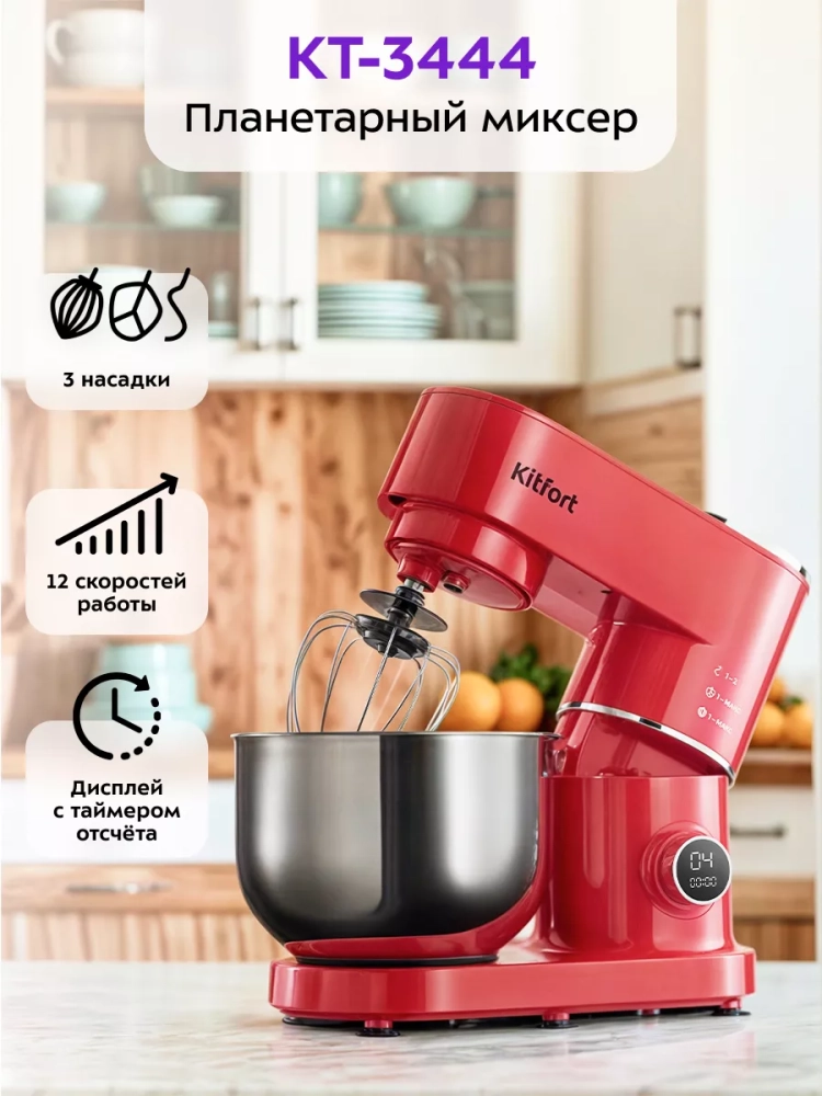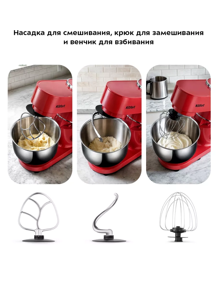 Многофункциональный планетарный миксер Kitfort КТ-3444 поможет вам смешать ингредиенты, взбить яичный белок или сливки, приготовить картофельное пюре, соус, крем, мусс, замесить жидкое тесто для блинов и крутое для пельменей и пирогов.