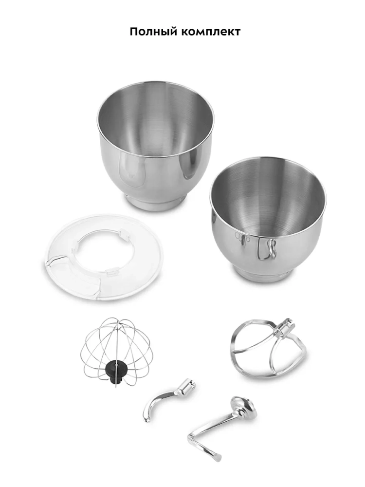 Миксер оснащен двумя чашами емкостью 6 и 7 литров. Чаши изготовлены из нержавеющей стали, они прочные и в них можно смешивать даже горячие ингредиенты. Вы можете выбрать любую чашу в зависимости от объема ингредиентов. Чаша закрепляется на моторном блоке и укомплектована защитной крышкой с загрузочным отверстием. Крышка предотвращает разбрызгивание ингредиентов при замешивании. А через загрузочное отверстие можно добавлять ингредиенты во время работы, не выключая миксер и не поднимая моторный блок.