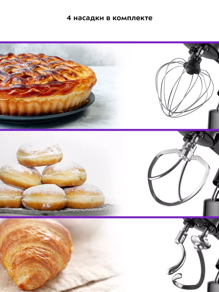 В комплекте к миксеру идут венчик для взбивания, насадка для смешивания и два крюка для замешивания. Венчик служит для взбивания яичных белков, сливок, замешивания жидкого теста. Насадка для смешивания используется для негустых ингредиентов, приготовления картофельного пюре, томатной пасты, кондитерских смесей, теста для тортов. Крюки для замешивания подойдут для замешивания густого теста.