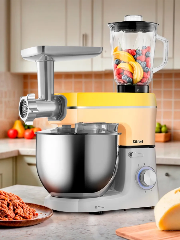 Многофункциональный планетарный миксер Kitfort «3 в 1» КТ-3468 поможет вам смешать ингредиенты, взбить яичный белок или сливки, приготовить картофельное пюре, соус, крем, мусс, замесить жидкое тесто для блинов и крутое — для пельменей и пирогов. Также он может перемолоть мясо на фарш и смешать фруктовые и фитнес-напитки, молочные коктейли, соусы и детское питание. В комплект входят мясорубка и блендер, что превращает эту модель в универсальную кухонную машину «3 в 1».