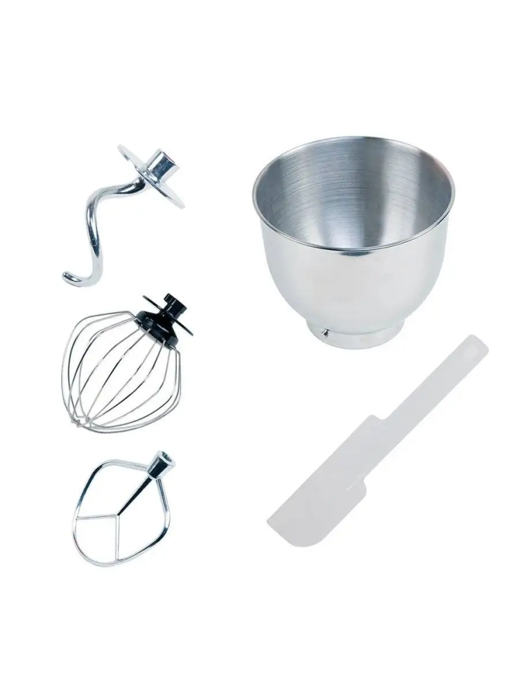 В комплекте идут насадки для взбивания, перемешивания и приготовления пюре и для замеса крутого теста, а также пластиковая лопатка для перемешивания ингредиентов вручную. Кончик лопатки скруглен по форме чаши для удобного соскребания налипших на стенки чаши продуктов.