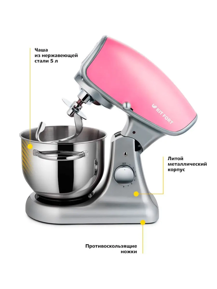 Ультрасовременный и мощный стационарный миксер Kitfort КТ-1336 поможет вам смешать ингредиенты, взбить яичный белок или сливки, приготовить картофельное пюре, соус, крем, мусс, замесить жидкое тесто для блинов и крутое для пельменей и пирогов. Миксер оснащен планетарной системой смешивания: во время работы насадка вращается вокруг своей оси и одновременно движется по окружности по внутреннему объему чаши, обеспечивая идеальное качество смешивания и ровную консистенцию без комков. Миксер может работать в полностью автоматическом режиме. Вам достаточно только положить ингредиенты, надеть насадку и включить прибор. Дальше он будет работать сам. Миксер позволяет плавно регулировать скорость от минимума до максимума. Импульсный режим служит для кратковременного включения миксера на максимальную скорость. Миксер оснащен чашей из нержавеющей стали объемом 5 литров. Форма насадок и чаши подобраны так, что при любом количестве продуктов насадка не оставляет их по краям неперемешанными.