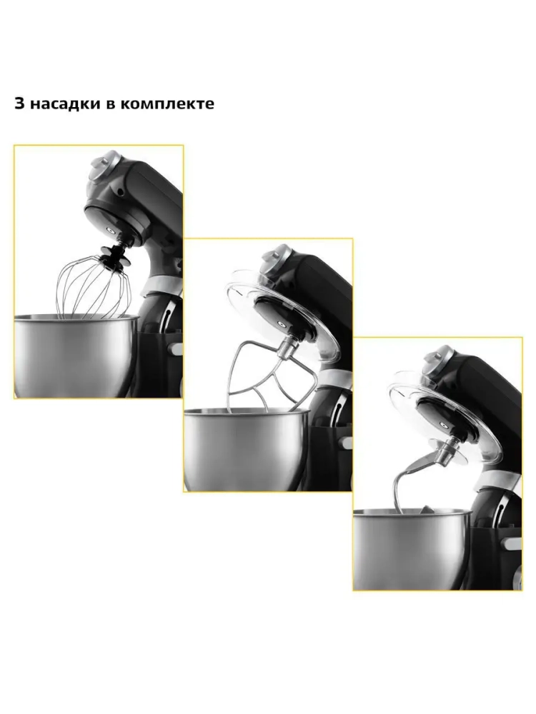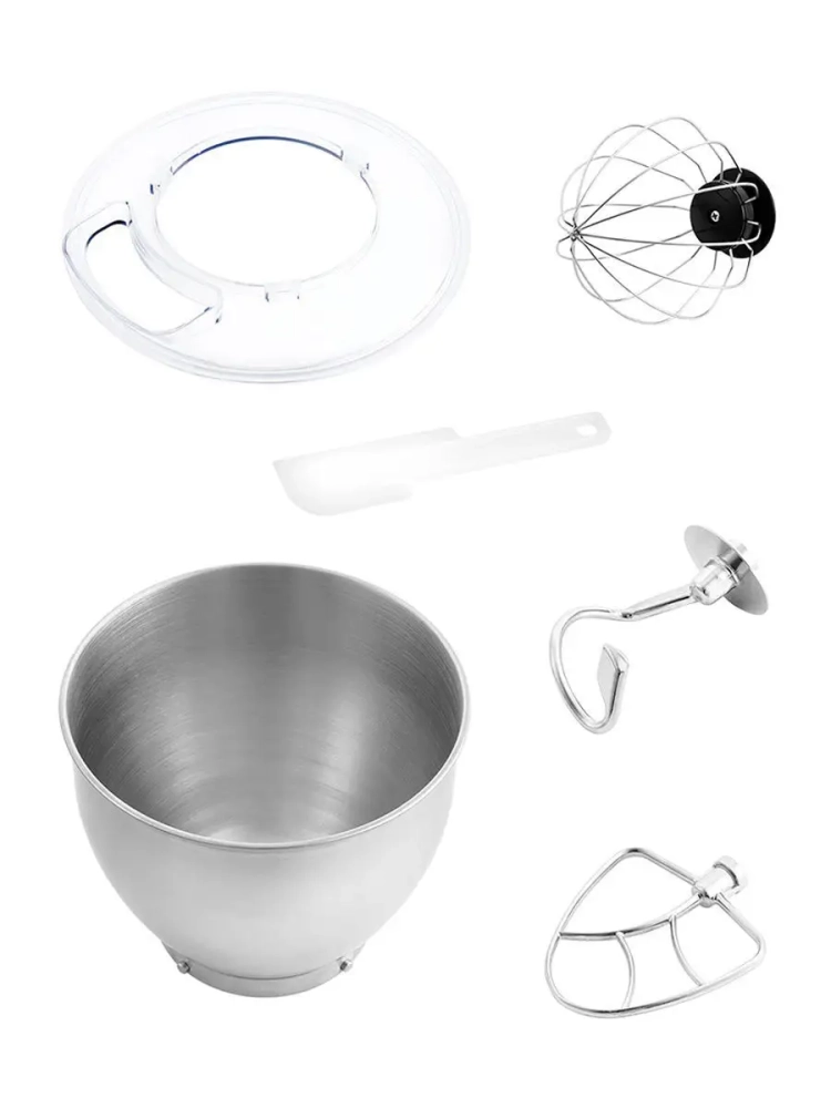 В комплекте идут венчик для взбивания, насадка для перемешивания и приготовления пюре и крюк для замеса крутого теста.