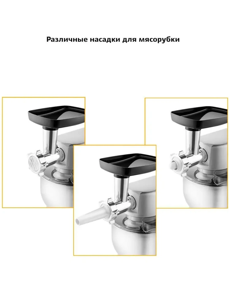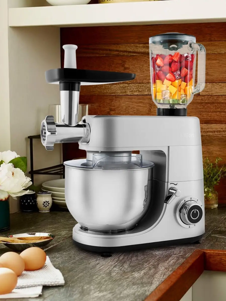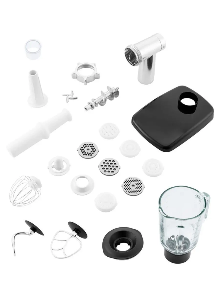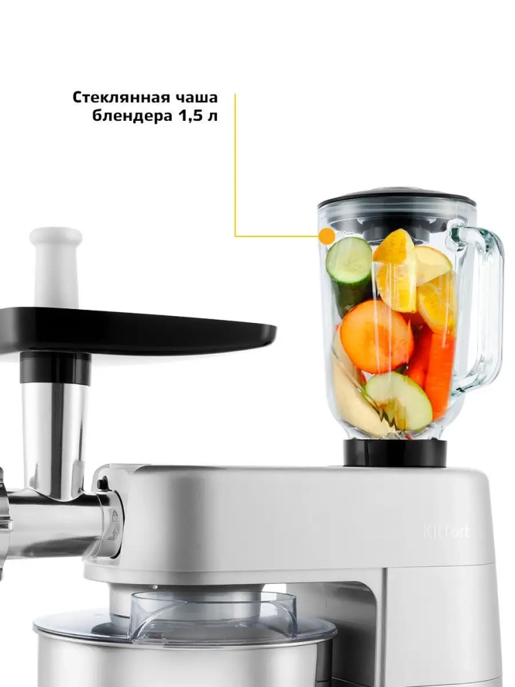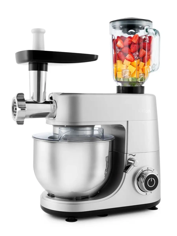 Многофункциональный и мощный планетарный миксер Китфорт КТ-1371 поможет вам смешать ингредиенты, взбить яичный белок или сливки, приготовить картофельное пюре, соус, крем, мусс, замесить жидкое тесто для блинов и крутое для пельменей и пирогов, перемолоть мясо на фарш, приготовить колбасу или кеббе и смешать ледяной коктейль или смузи. В комплекте миксера имеется блендер и мясорубка, что превращает эту модель в универсальную кухонную машину «3 в 1».