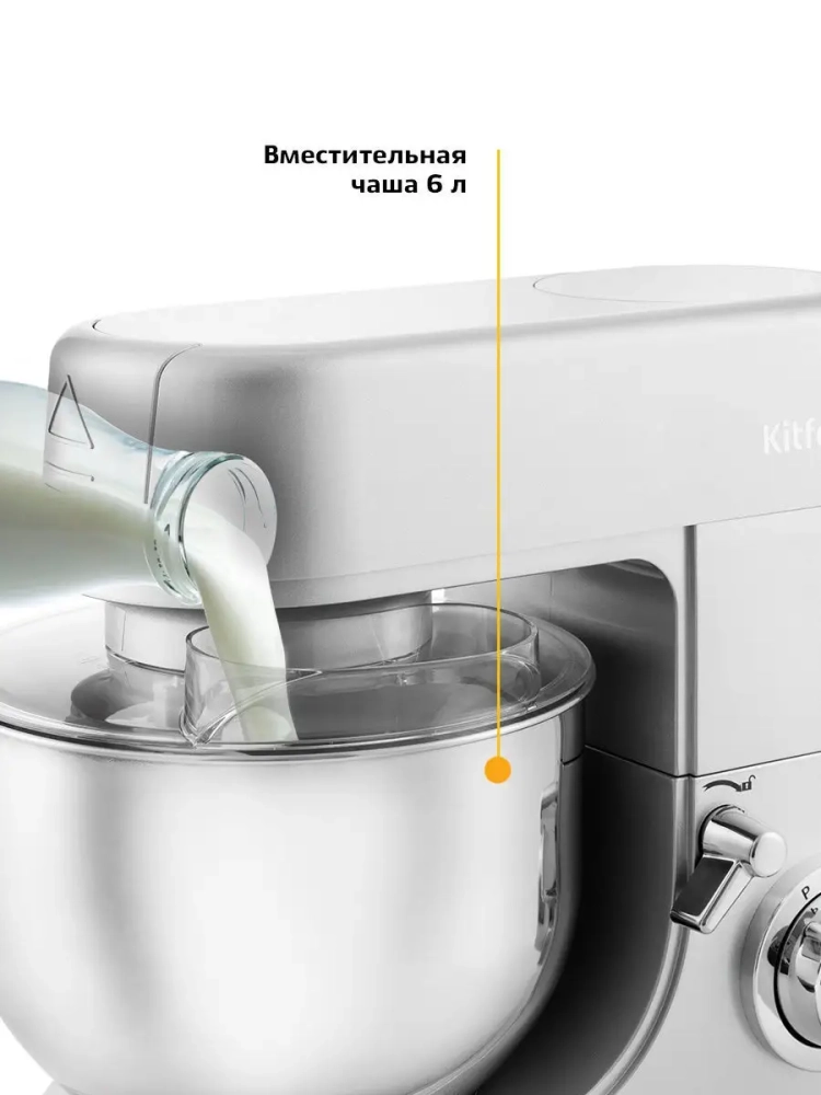 Миксер оснащен большой чашей объемом 6 литров. Форма насадок и чаши подобраны так, что при любом количестве продуктов насадка не оставляет их по краям неперемешанными.