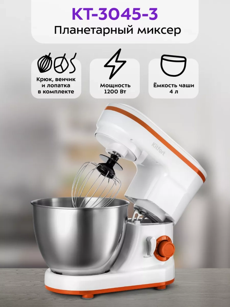 Многофункциональный и мощный планетарный миксер Kitfort КТ-3045 поможет вам смешать ингредиенты, взбить яичный белок или сливки, приготовить картофельное пюре, соус, крем, мусс, замесить жидкое тесто для блинов и крутое — для пельменей и пирогов.