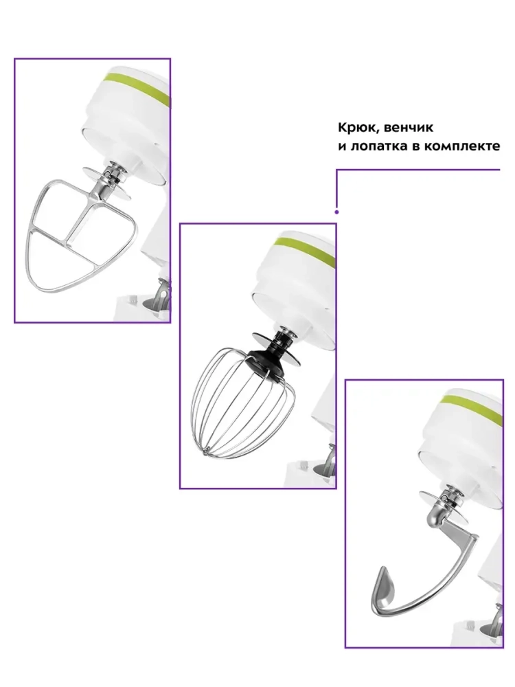 В комплекте идут венчик для взбивания, крюк для замеса крутого теста и насадка для смешивания и приготовления пюре.