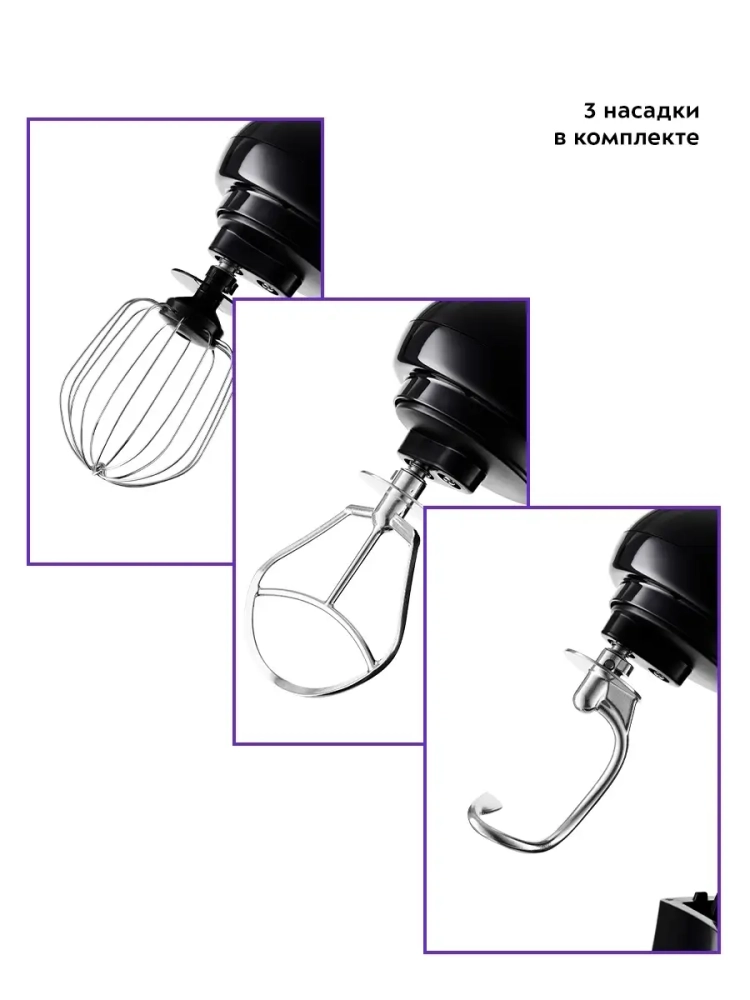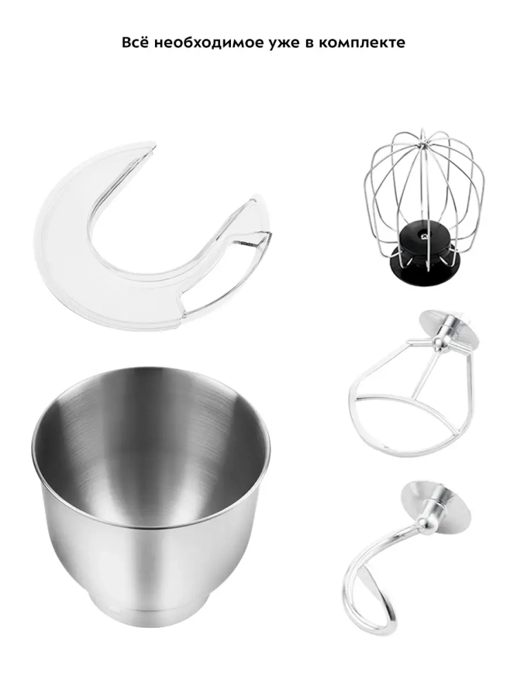 В комплекте идут венчик для взбивания, крюк для замеса крутого теста и насадка для смешивания и приготовления пюре.