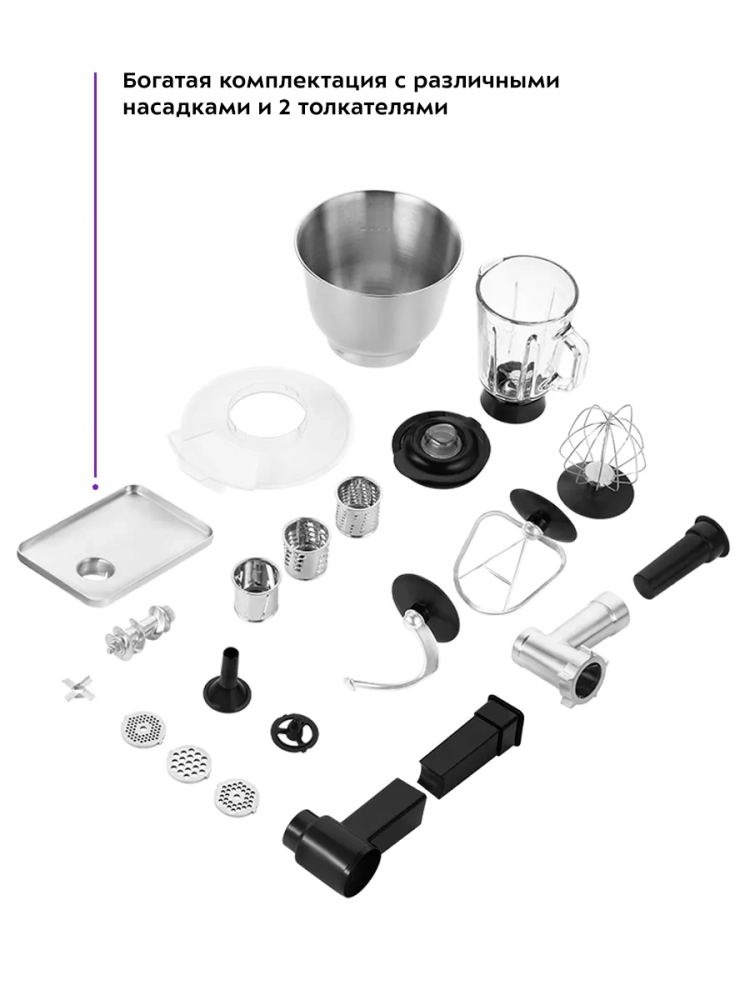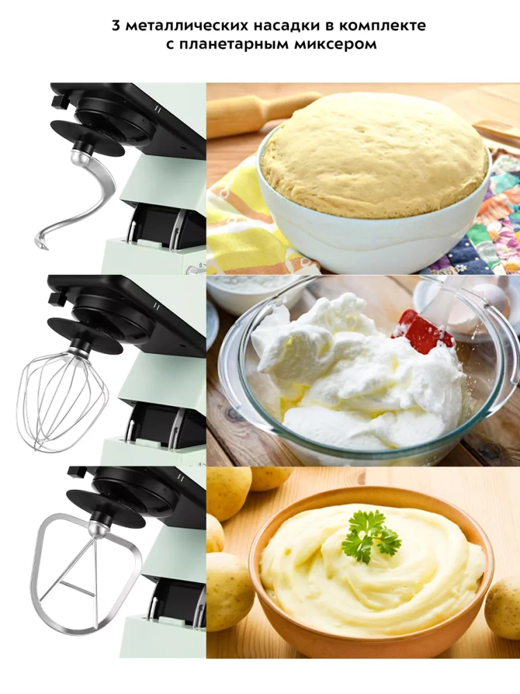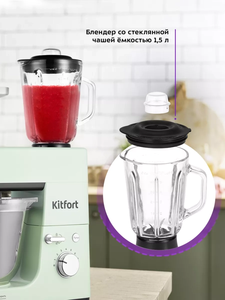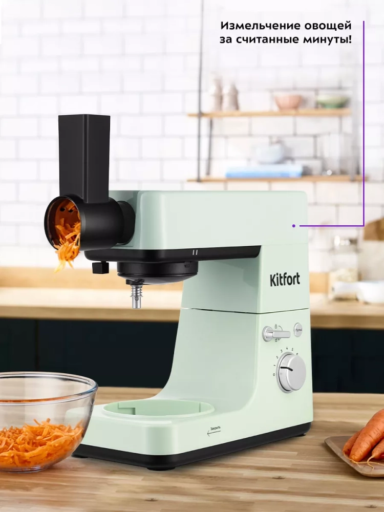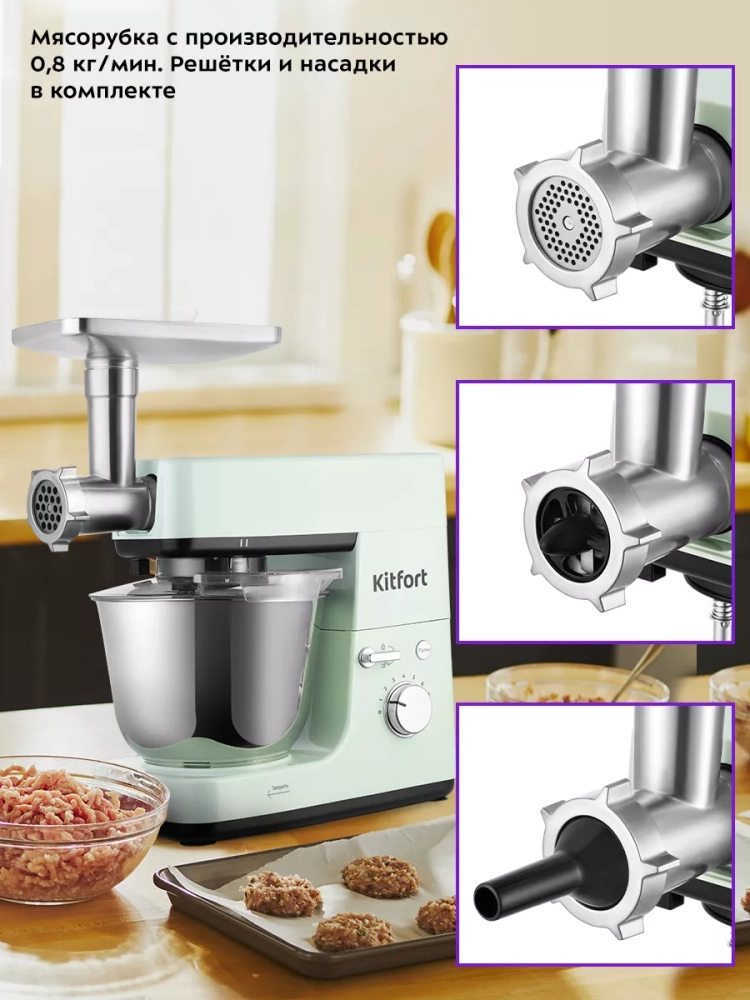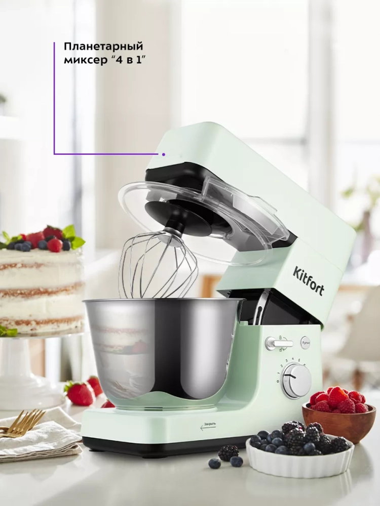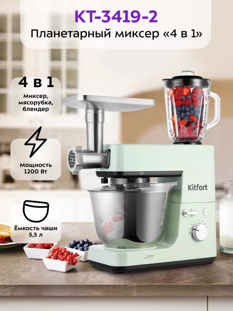 Многофункциональный планетарный миксер Kitfort КТ-3419 (4 в 1) поможет вам смешать ингредиенты, взбить яичный белок или сливки, приготовить картофельное пюре, соус, крем, мусс, замесить жидкое тесто для блинов и крутое — для пельменей и пирогов. В комплект также входит мясорубка, овощерезка и блендер, что превращает эту модель в универсальную кухонную машину «4 в 1».