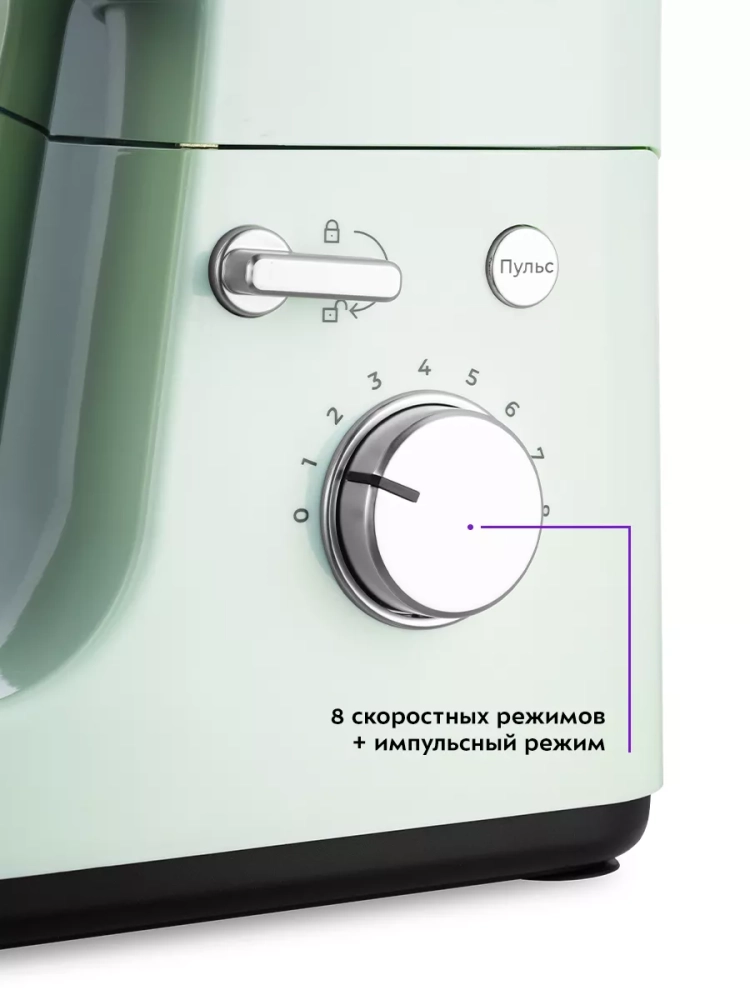 При включении миксера скорость вращения регулируется, чтобы предотвратить разбрызгивание ингредиентов. У прибора 8 скоростей и импульсный режим, который позволяет замешивать ингредиенты на максимальной скорости с частыми паузами.
