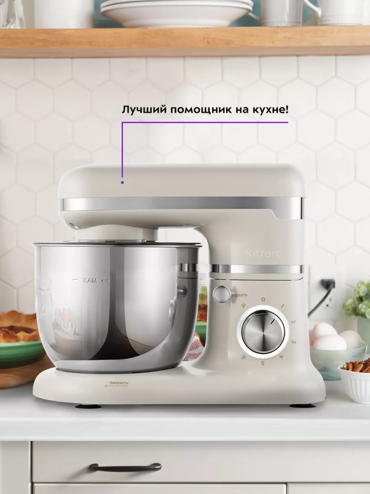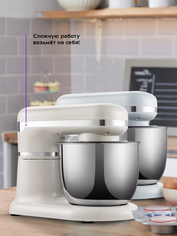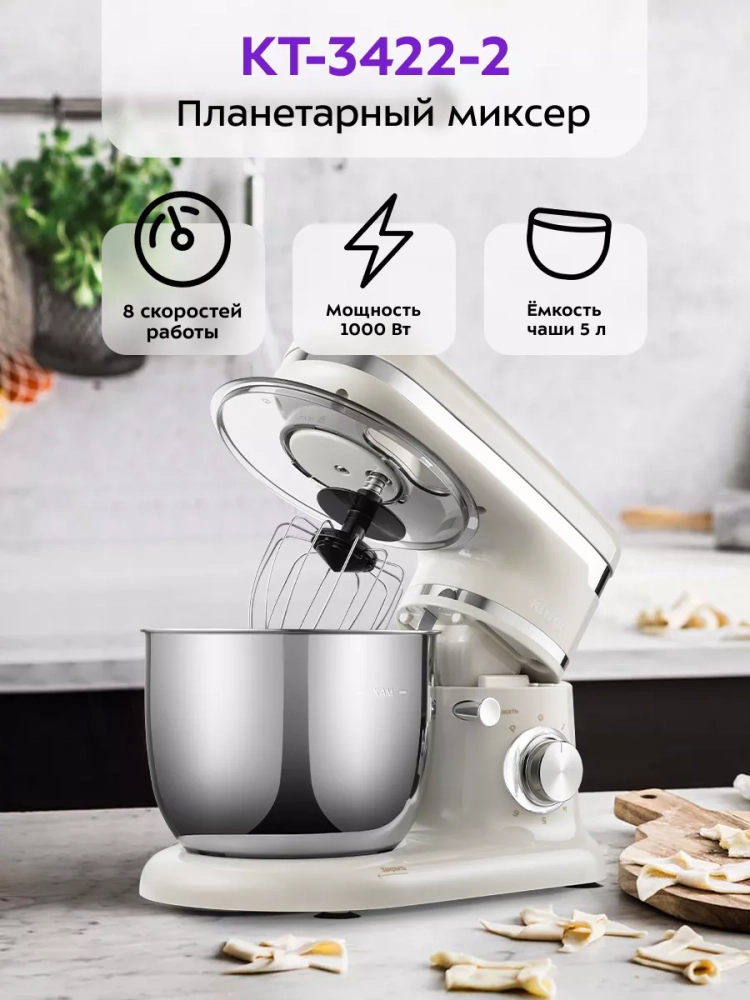 Планетарный миксер Kitfort КТ-3422 поможет вам смешать ингредиенты, взбить яичный белок или сливки, приготовить картофельное пюре, соус, крем, мусс, замесить жидкое тесто для блинов и крутое — для пельменей и пирогов. В комплекте миксера имеется три насадки.