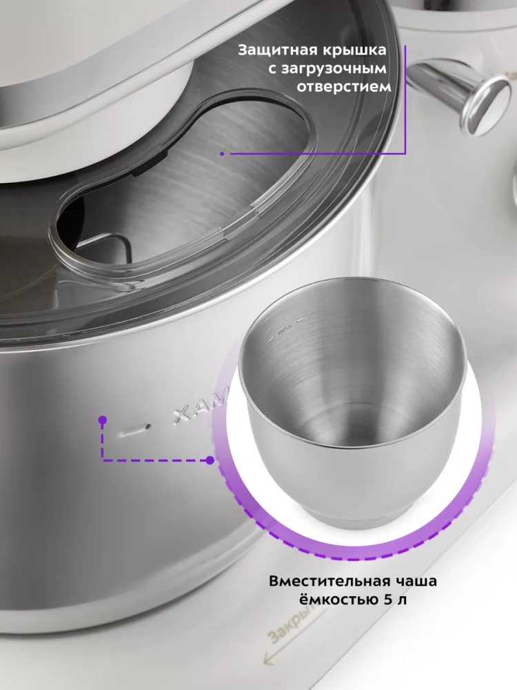 Миксер оснащен большой чашей объемом 5 литров. Чаша изготовлена из нержавеющей стали, она прочная и в ней можно смешивать даже горячие ингредиенты. Чаша закрепляется на моторном блоке и укомплектована защитной крышкой с отверстием. Крышка предотвращает разбрызгивание ингредиентов при замешивании. Через загрузочное отверстие в крышке можно добавлять ингредиенты во время работы, не выключая миксер и не поднимая моторный блок.