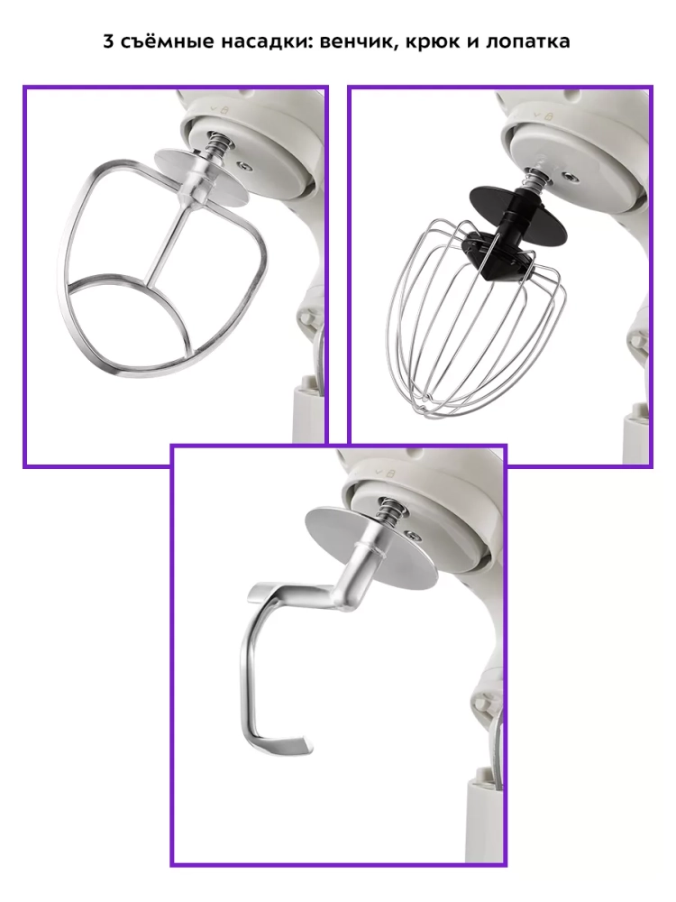 Венчик служит для взбивания яичных белков, сливок, замешивания жидкого теста. Насадка для смешивания используется для негустых ингредиентов, приготовления картофельного пюре, томатной пасты, кондитерских смесей, теста для тортов или блинов.