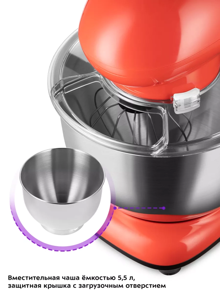 Миксер оснащен большой чашей емкостью 5,5 литров. Чаша изготовлена из нержавеющей стали, она прочная, и в ней можно смешивать даже горячие ингредиенты. Чаша закрепляется на моторном блоке и укомплектована защитной крышкой с отверстием. Крышка предотвращает разбрызгивание ингредиентов при замешивании. Через загрузочное отверстие в крышке можно добавлять ингредиенты во время работы, не выключая миксер и не поднимая моторный блок.