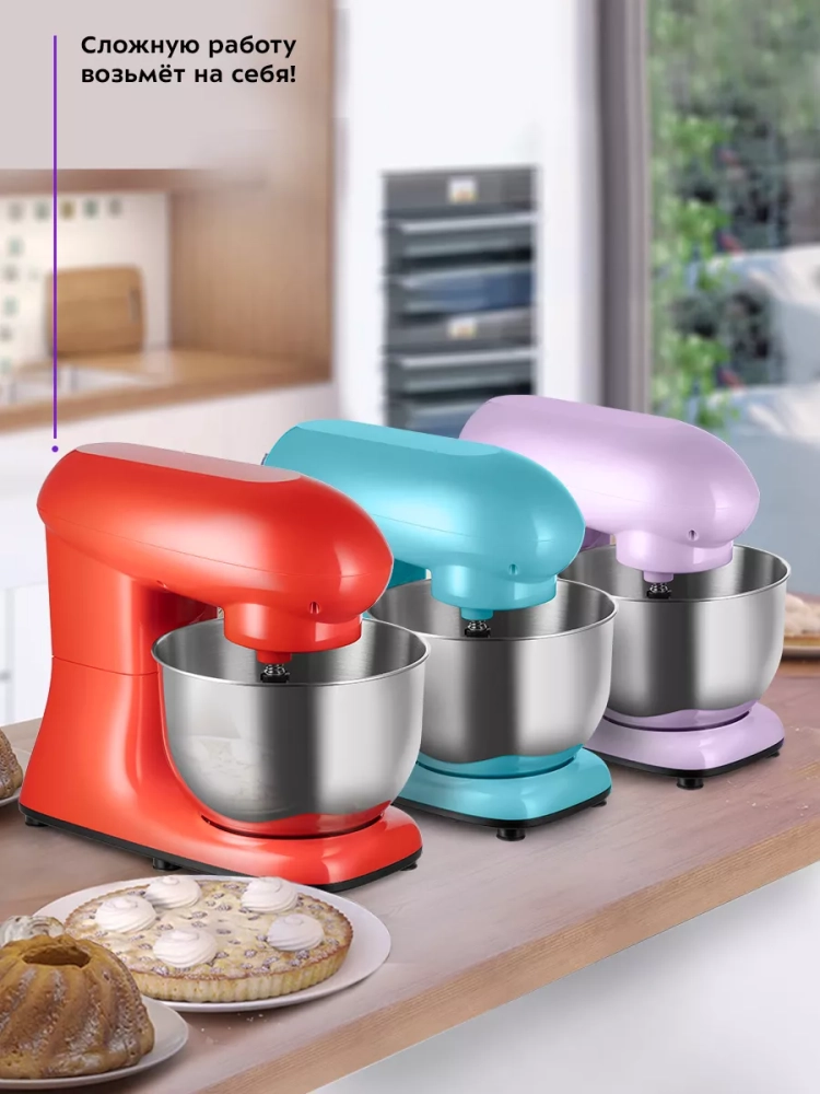 Планетарный миксер Kitfort КТ-3433 поможет вам смешать ингредиенты, взбить яичный белок или сливки, приготовить картофельное пюре, соус, крем, мусс, замесить жидкое тесто для блинов и крутое — для пельменей и пирогов. В комплекте миксера имеется три насадки.