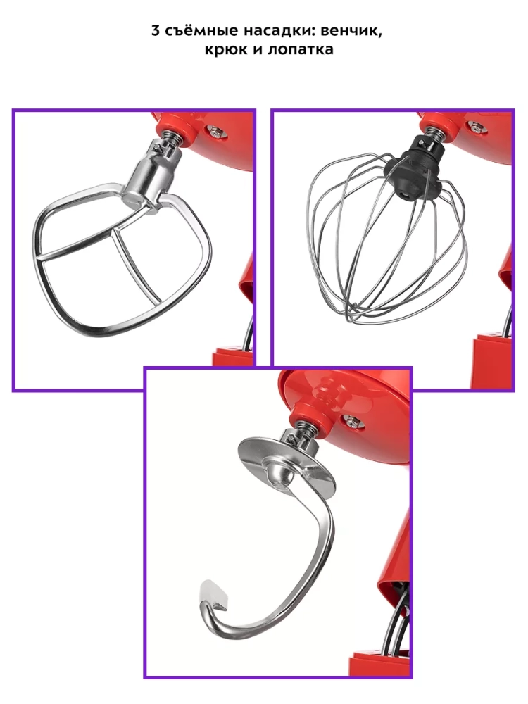 Венчик служит для взбивания яичных белков, сливок, замешивания жидкого теста. Насадка для смешивания используется для негустых ингредиентов, приготовления картофельного пюре, томатной пасты, кондитерских смесей, теста для тортов или блинов. Крюк для замешивания подойдет для замешивания густого теста.