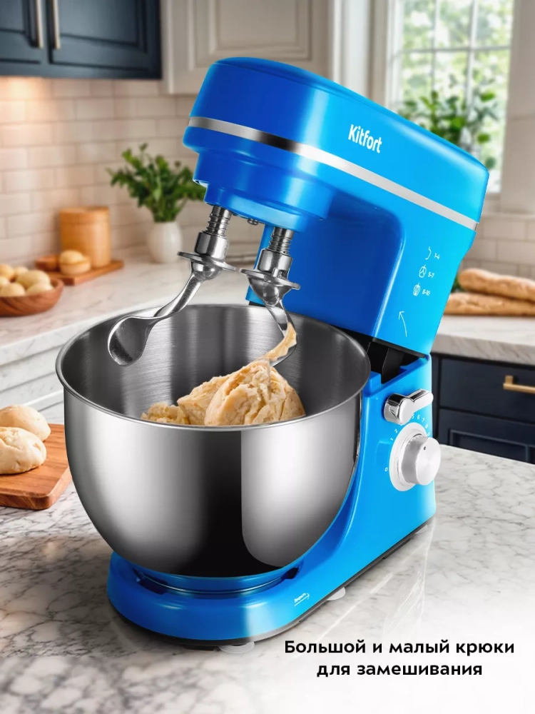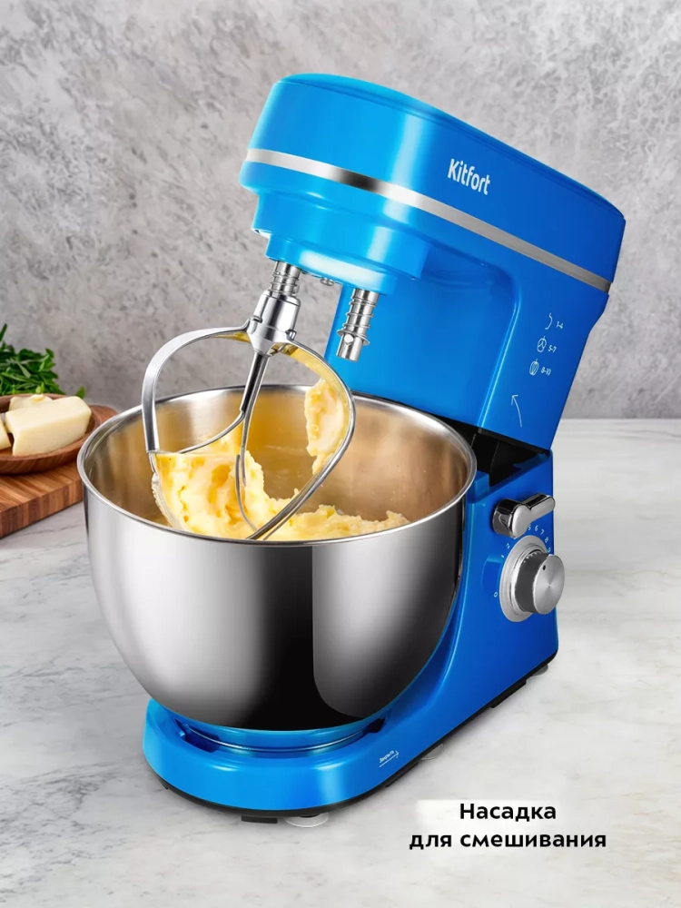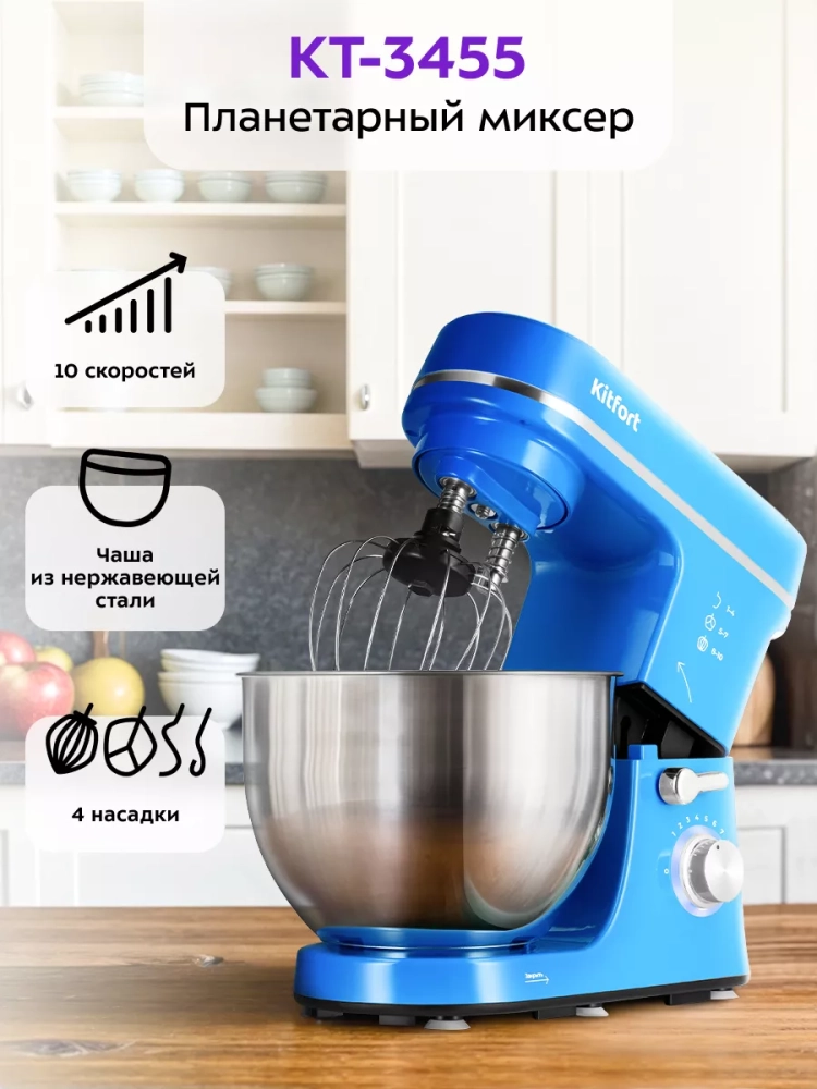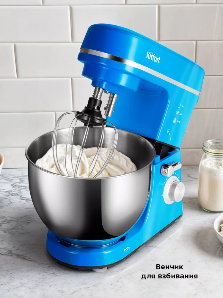 Планетарный миксер Kitfort КТ-3455 поможет вам смешать ингредиенты, взбить яичный белок или сливки, приготовить картофельное пюре, соус, крем, мусс, замесить жидкое тесто для блинов и крутое — для пельменей и пирогов. В комплекте есть четыре насадки.