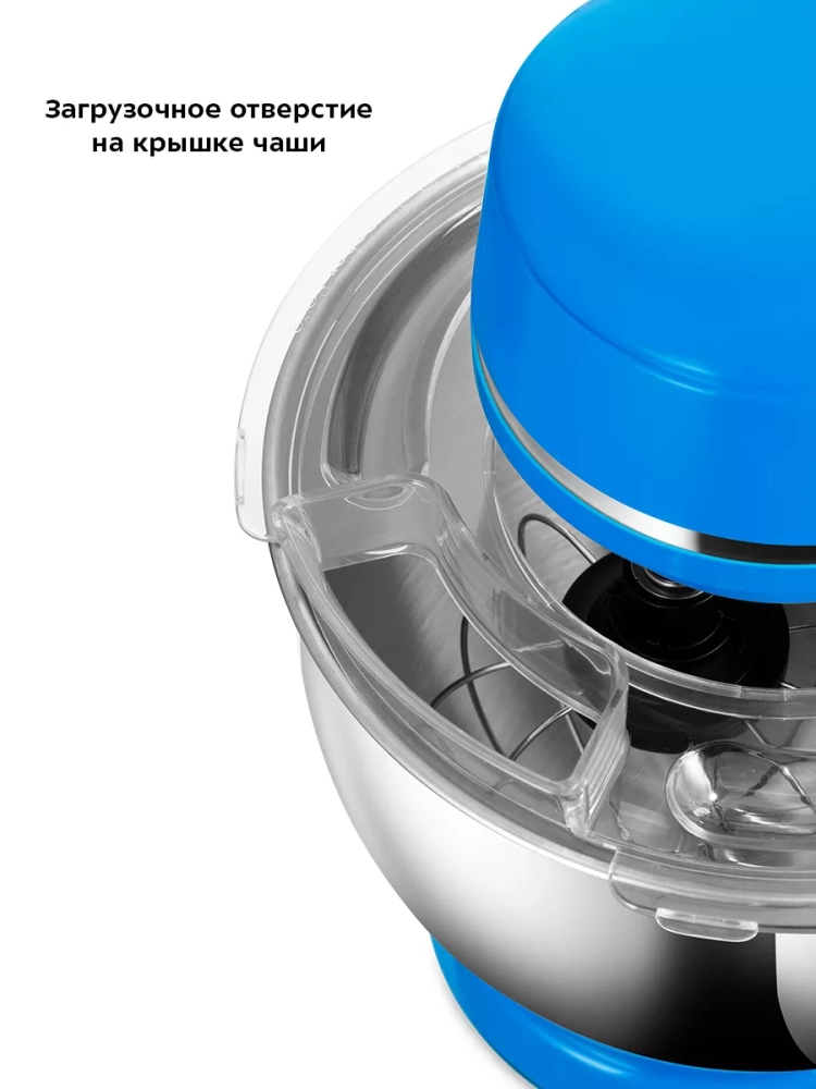 Чаша закрепляется на моторном блоке и укомплектована защитной крышкой с загрузочным отверстием. Крышка предотвращает разбрызгивание ингредиентов. Через загрузочное отверстие в крышке можно добавлять ингредиенты во время работы, не выключая миксер и не поднимая моторный блок.
