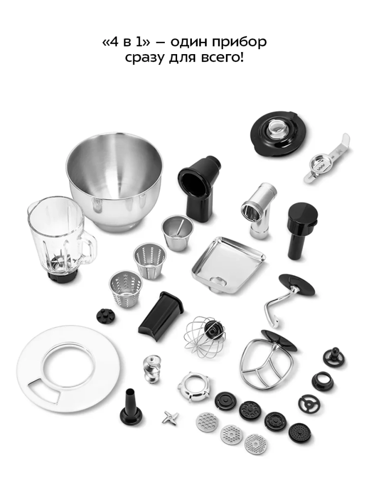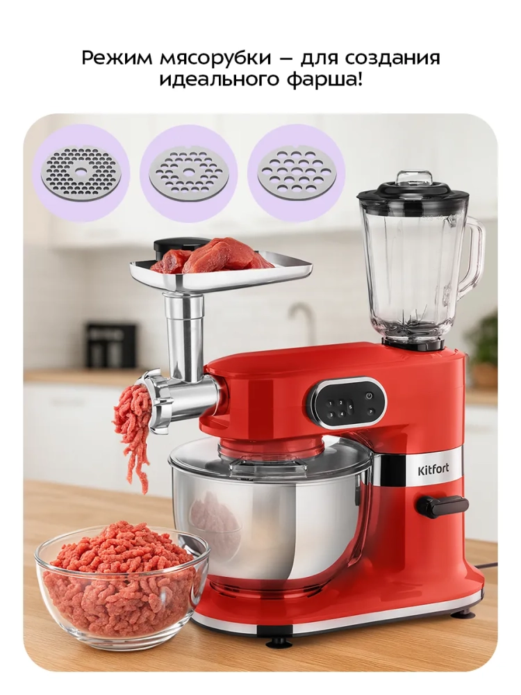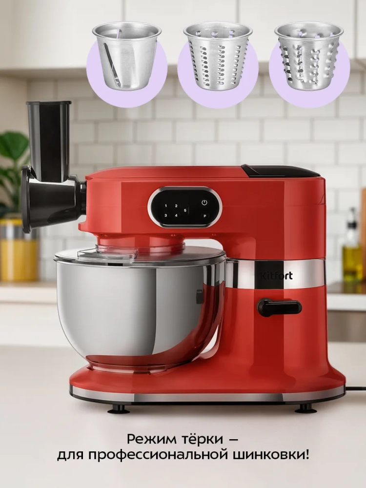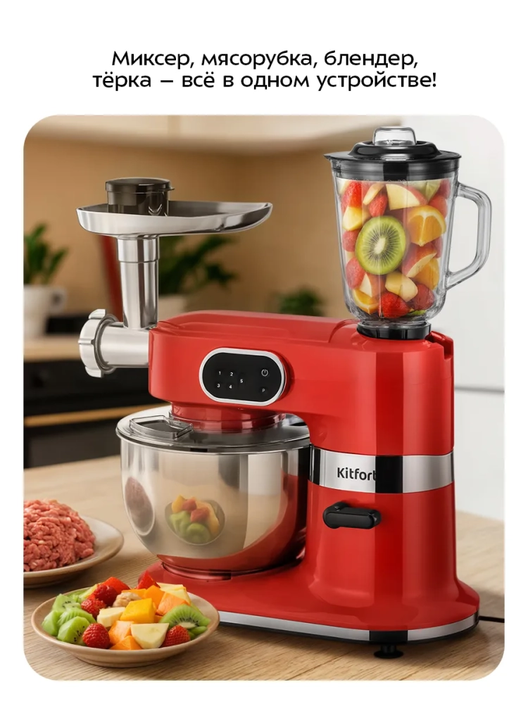 Многофункциональный планетарный миксер Kitfort «4 в 1» КТ-4419 поможет вам смешать ингредиенты, взбить яичный белок или сливки, приготовить картофельное пюре, соус, крем, мусс, замесить жидкое тесто для блинов и крутое для пельменей и пирогов. В комплект входят мясорубка, терка и блендер, что превращает эту модель в универсальную кухонную машину «4 в 1».