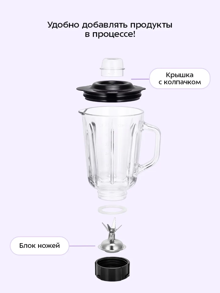 Блендер идеально подходит для смешивания фруктовых и фитнес-напитков, приготовления смузи, протеиновых смесей, молочных коктейлей, супов-пюре, соусов и детского питания. В комплекте блендера идет вместительная чаша с мерной шкалой емкостью 1,5 литра, в крышке которой есть отверстие, закрываемое колпачком, для добавления ингредиентов непосредственно во время работы. Чаша блендера выполнена из стекла.