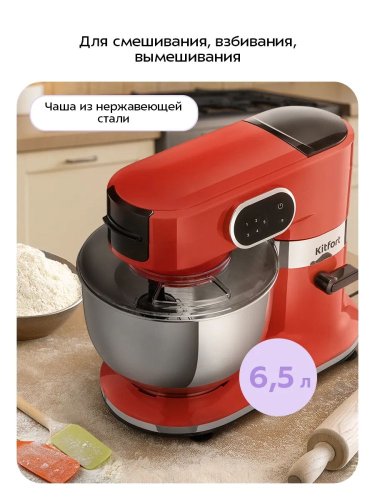 Миксер оснащен чашей емкостью 6,5 литров. Чаша изготовлена из нержавеющей стали, она прочная, и в ней можно смешивать даже горячие ингредиенты.