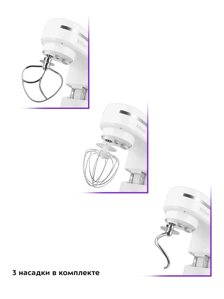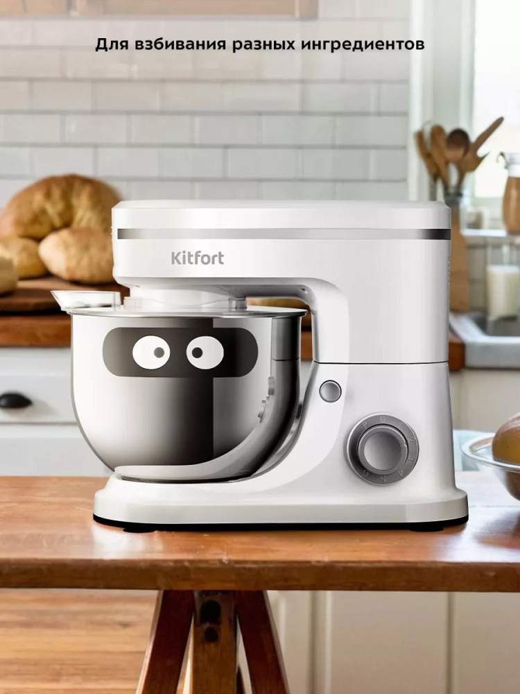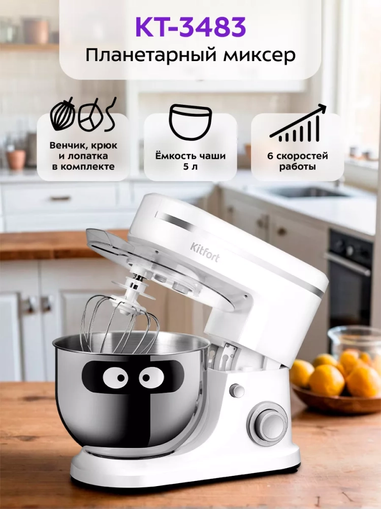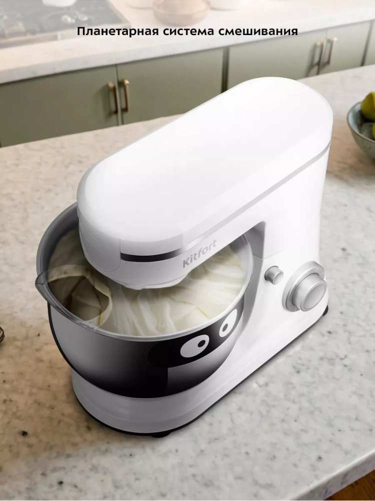 Планетарный миксер Kitfort КТ-3483 поможет вам смешать ингредиенты, взбить яичные белки или сливки, приготовить картофельное пюре, соус, крем, мусс, замесить жидкое тесто для блинов и крутое — для пельменей и пирогов.