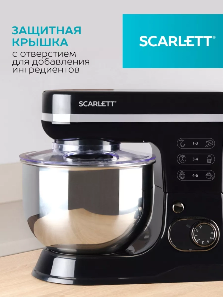 В комплект входит крюк для замешивания густого теста, венчик для взбивания белков, лопатка для смешивания, а также чаша объемом 5.2л.