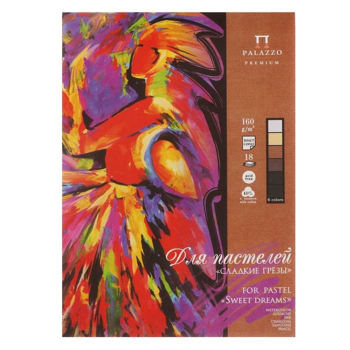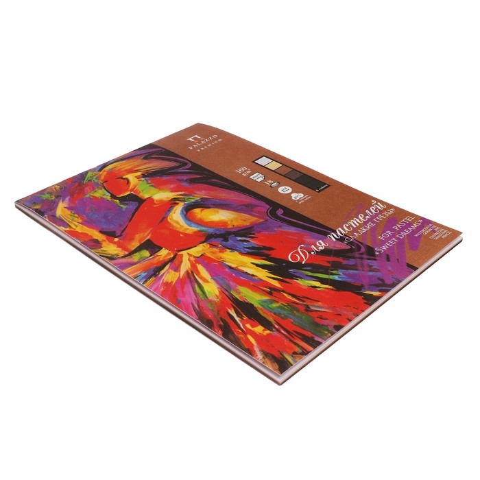 Замечательно подходит для художественных техник, таких как пастель, масляная пастель, мел, карандаш или уголь, сангина. Планшет состоит из 18 листов и 6 цветов пастельной бумаги с жесткой подложкой из переплетного картона. Внутренний блок для удобства проклеен с 2-х сторон по корешку. Бумага внутреннего блока имеет плотность 160 г/м2, состоит из 40 % хлопкового волокна и имеет тиснение "Холст" с одной стороны, как все импортные аналоги, предназначенные для пастельных работ. Каждое изделие упаковано в термоусадочную пленку.