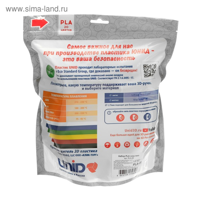 Пластик UNID PLA-20, для 3Д ручки, 20 цветов в наборе, по 10 метров