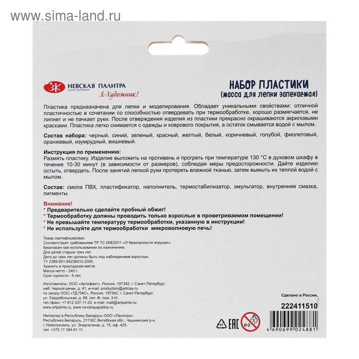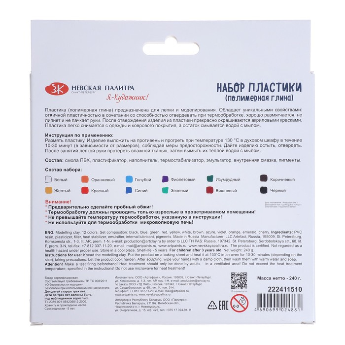 Инструкция по применению: Перед началом работы пластику рекомендуется размять теплыми руками до состояния эластичности. Для этого лучшего всего, отрезать или отломать от бруска часть, размером не более 1 см, так пластику будет размять легче и быстрее. После моделирования, для достижения прочности и долговечности готового изделия, пластику запекают при температуре 130 градусов в духовке, время запекания зависит от размеров готового изделия, от 5 до 30 минут. Дайте изделию остыть, отвердеть. После занятий лепкой руки протереть влажной тканью, затем вымыть их теплой водой с мылом.