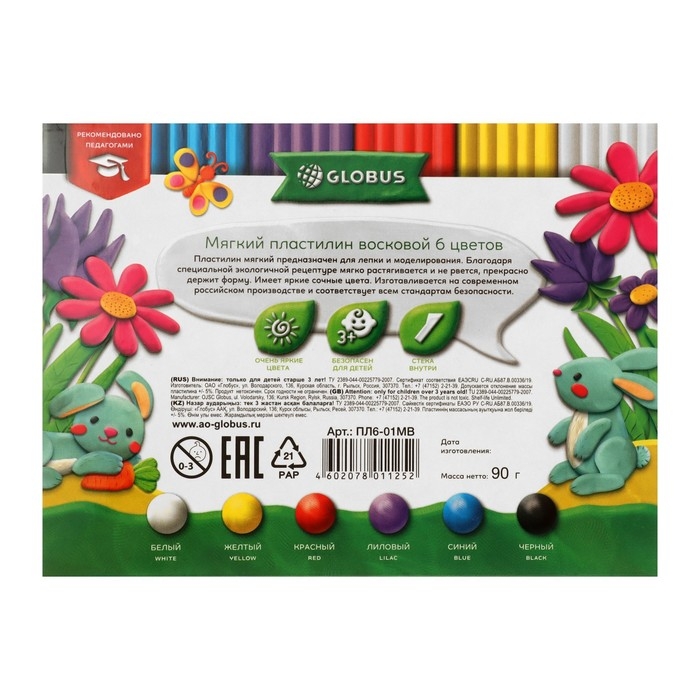 Пластилин мягкий (восковой), 6 цветов, 90 г, GLOBUS, с Алоэ Вера, со стеком