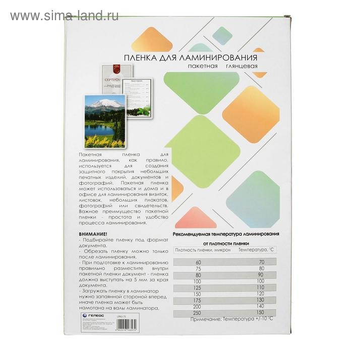 Глянцевая пакетная пленка Гелеос формата А3, размером 303 x 426 мм и толщиной 75 мкм прекрасно подходит для ламинирования документов. Она предназначена для использования в ламинаторах «горячего» типа. В упаковке 100 листов.
