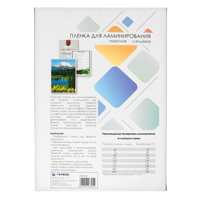 Пленка для ламинирования A4 216х303 мм, 250 мкм, 100 штук, глянцевые, Гелеос
