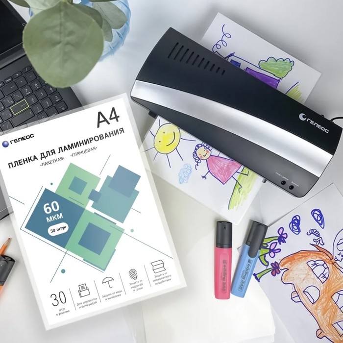 Пленка для ламинирования А4, 60 мкм, 30 штук, глянцевая, Гелеос