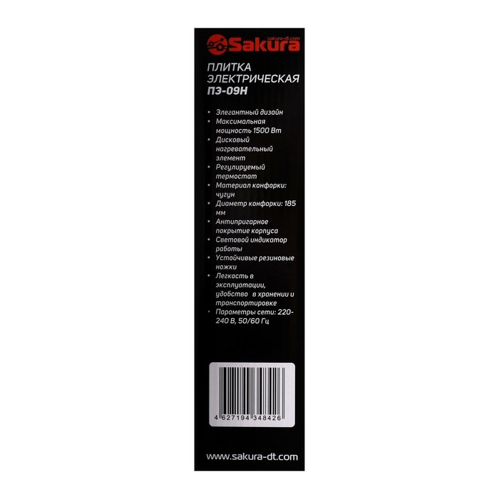 Плитка электрическая Sakura ПЭ-09Н, 1500 Вт, 1 конфорка, серебристая
