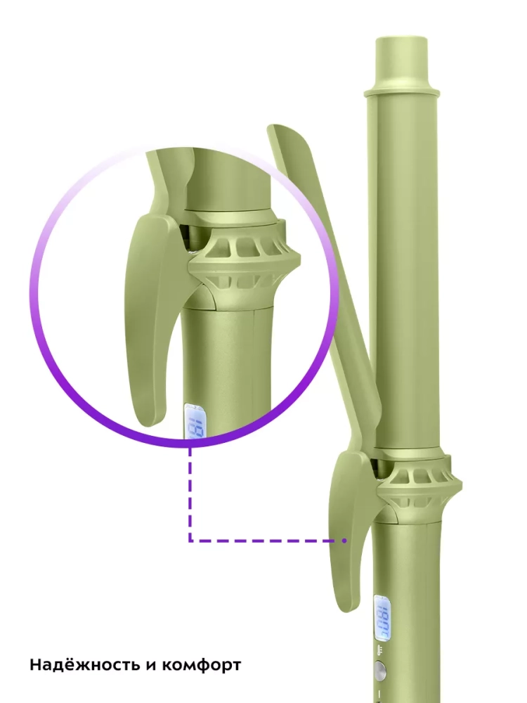 С помощью специального рычага, выполненного из пластика, зажим для волос на рабочей поверхности плойки легко открывается. Рычаг не нагревается, удобно лежит под пальцем благодаря своей форме.