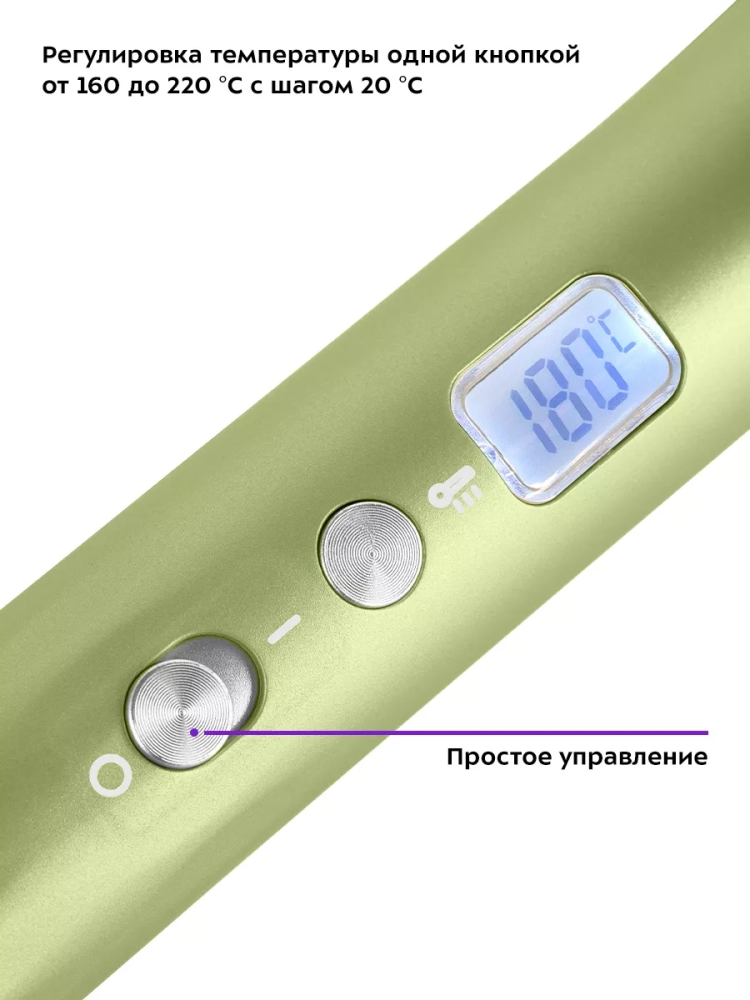 Устройство имеет 4 температурными режимами, что позволит подобрать температуру, подходящую именно для вашего типа волос. Вы можете установить температуру нагрева от 160 до 220 °C с шагом 20 °C. Плойка для волос готова к работе через 1–4 минуты в зависимости от выбранной температуры.