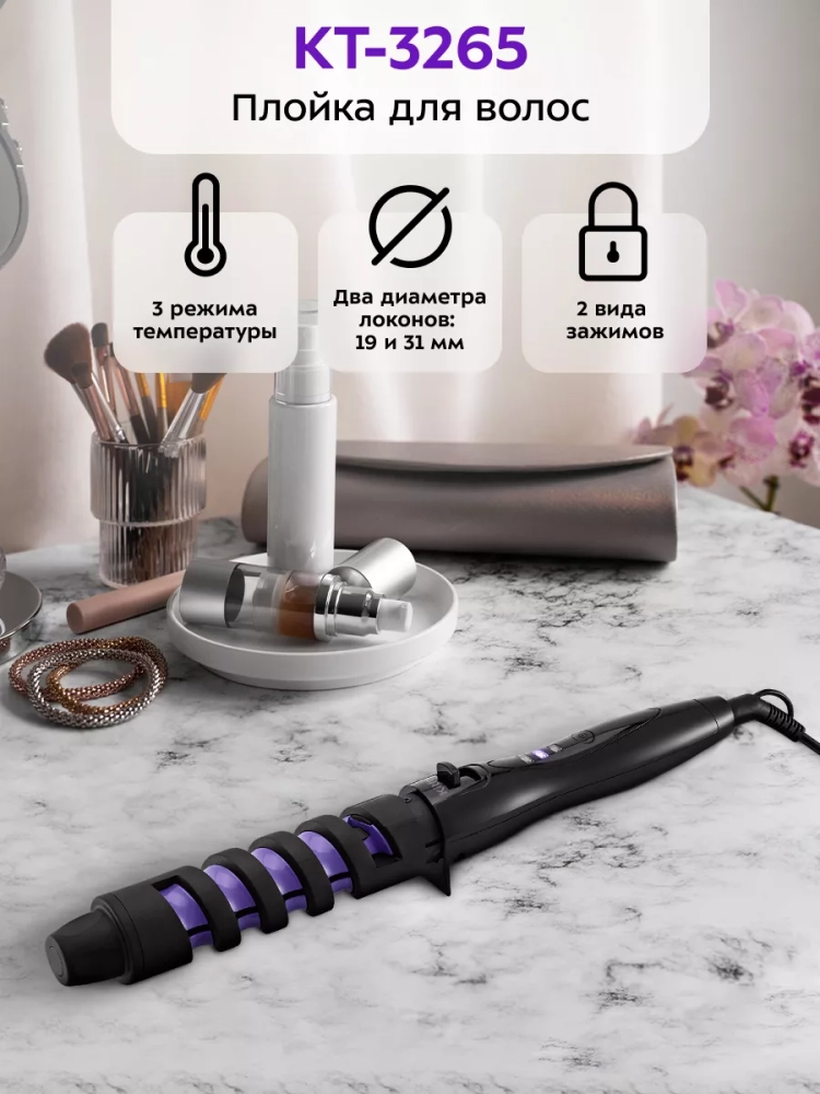 Плойка для волос Kitfort KT-3265 позволит легко и быстро сделать красивые локоны. Диаметр рабочей поверхности плойки можно регулировать, поэтому вы сможете делать разную прическу: более мелкие или более крупные кудри. Форма плойки позволяет укладывать локон по спирали, что облегчает процесс создания кудрей и позволяет делать их одинаковыми по толщине.