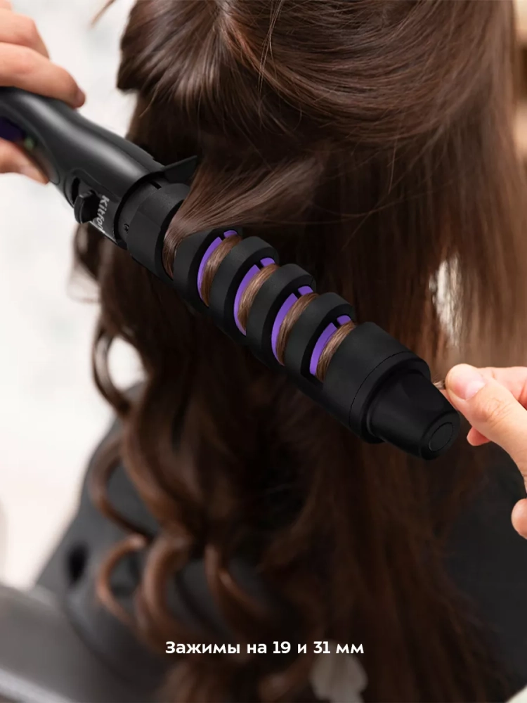 У прибора два зажима на разном уровне, один для рабочей поверхности диаметром 19 мм, другой для рабочей поверхности диаметром 31 мм. При работе с устройством видно и можно использовать только один зажим, так как второй находится за спиралью. Зажимы позволяют легко захватывать локон при накручивании.