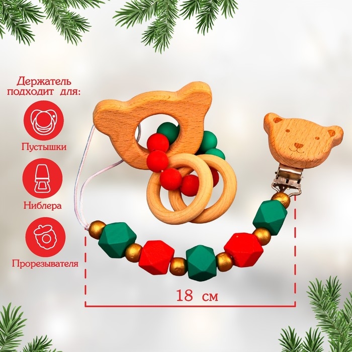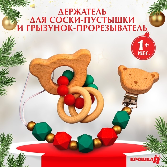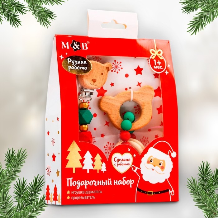 Подарочный набор «Дед Мороз», 2 предмета: держатель для соски-пустышки и грызунок-прорезыватель, новогодняя подарочная упаковка