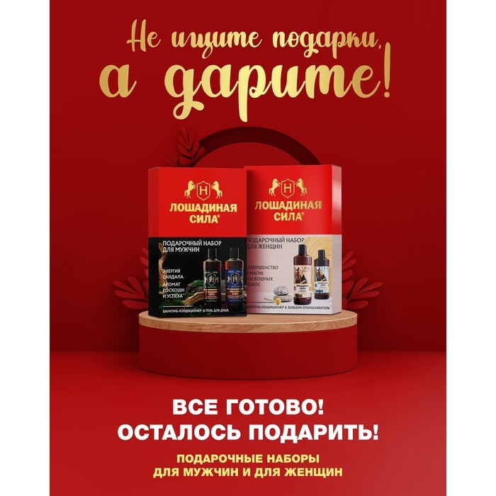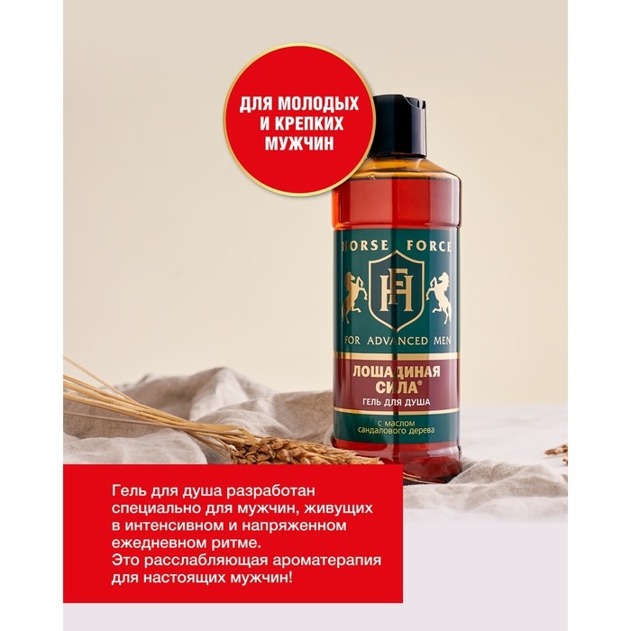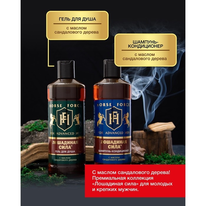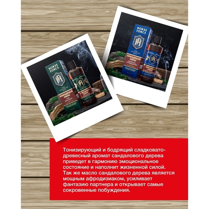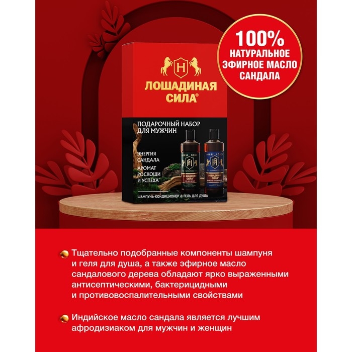 Подарочный набор «Лошадиная сила» с маслом сандалового дерева только для молодых и крепких мужчин. Шампунь и гель - прозрачные, цвет - коньяк, консистенция не густая, аромат - древесный, сандал.