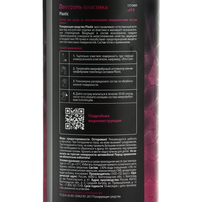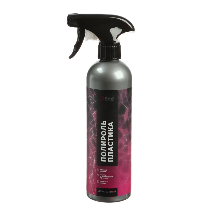 - Полироль пластика Detail предназначен для восстановления и поддержания первоначального вида пластиковых деталей автомобиля. Он эффективно очищает поверхность от различных загрязнений, возвращает утраченный блеск и защищает от выгорания на солнце. Продукт обладает приятным ароматом и антистатическим эффектом.