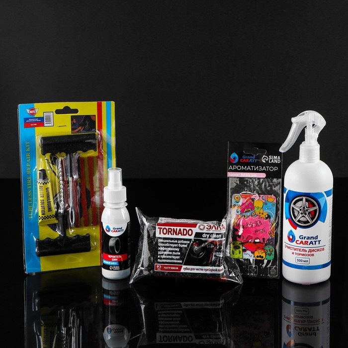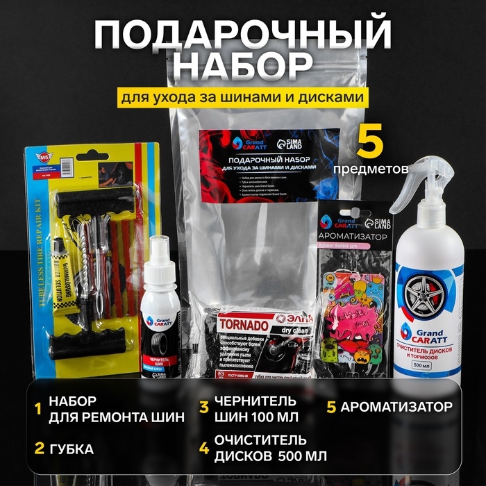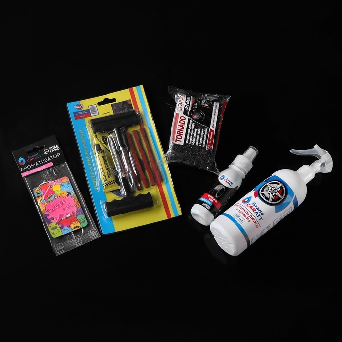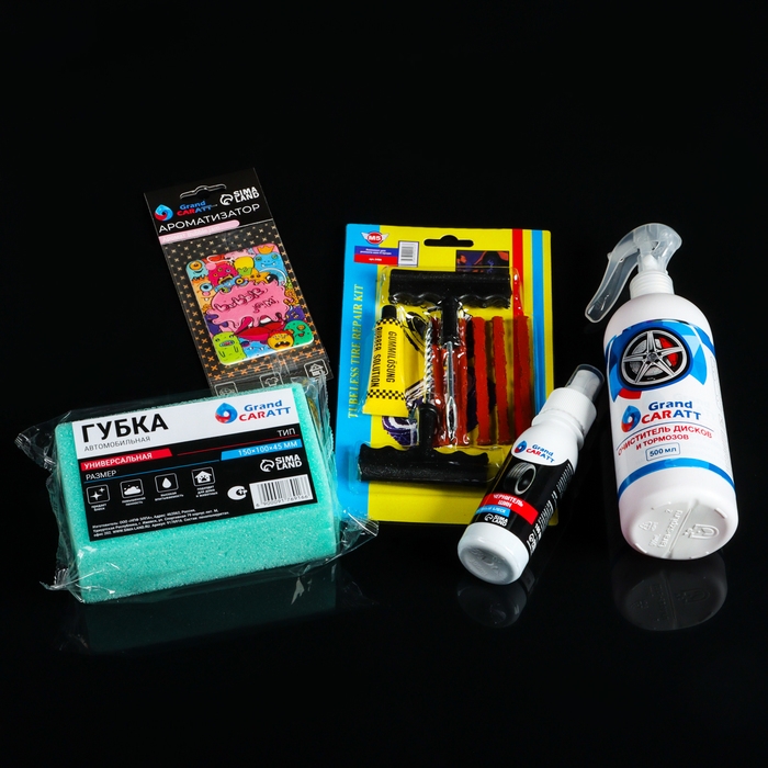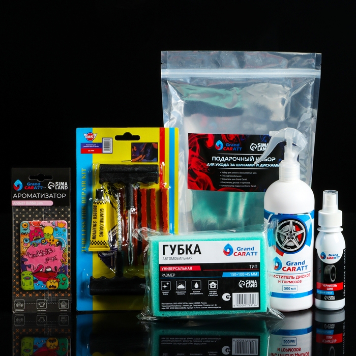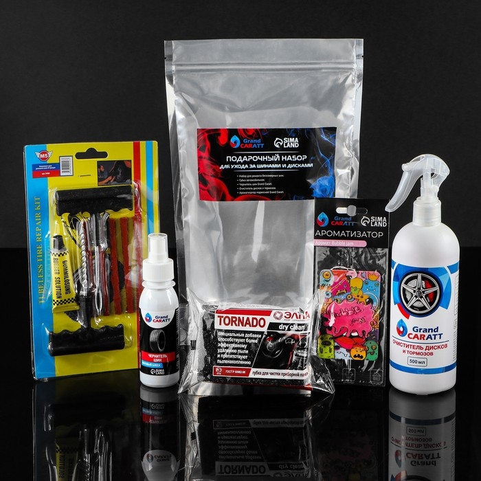 Подарочный набор для ухода за шинами и дисками Grand Caratt: набор для ремонта бескамерных шин, губка автомобильная, чернитель шин 100 мл, очиститель дисков и тормозов 500 мл, ароматизатор подвесной