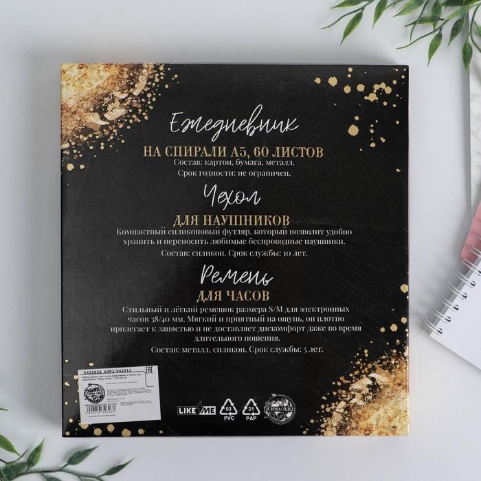 Подарочный набор с ежедневником, ремнём для часов и чехлом для наушников пойдет деловым людям, которые желают всегда оставаться на связи и держать всё под контролем.